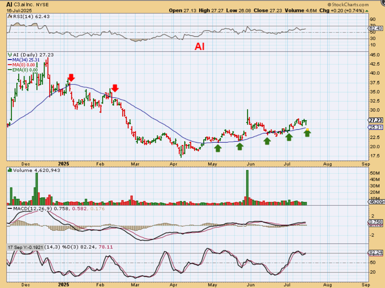 AI – BBAI has been running nicely and AI has been choppy and lagging a bit. It is slowly bouncing up along the 34 sma, but it is a bullish set up.