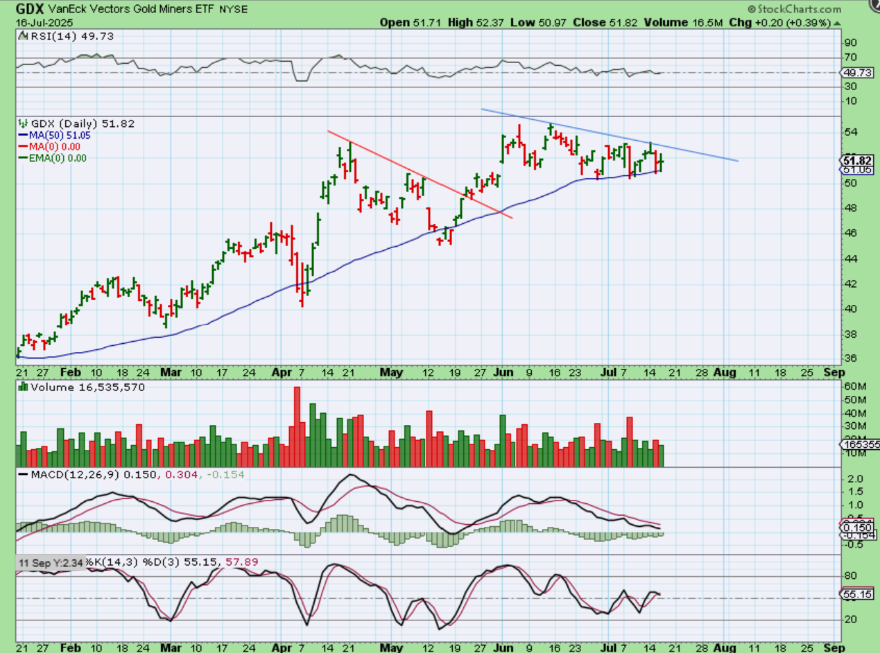 GDX continues to hold the 50sma and is also as choppy as Gold has been.