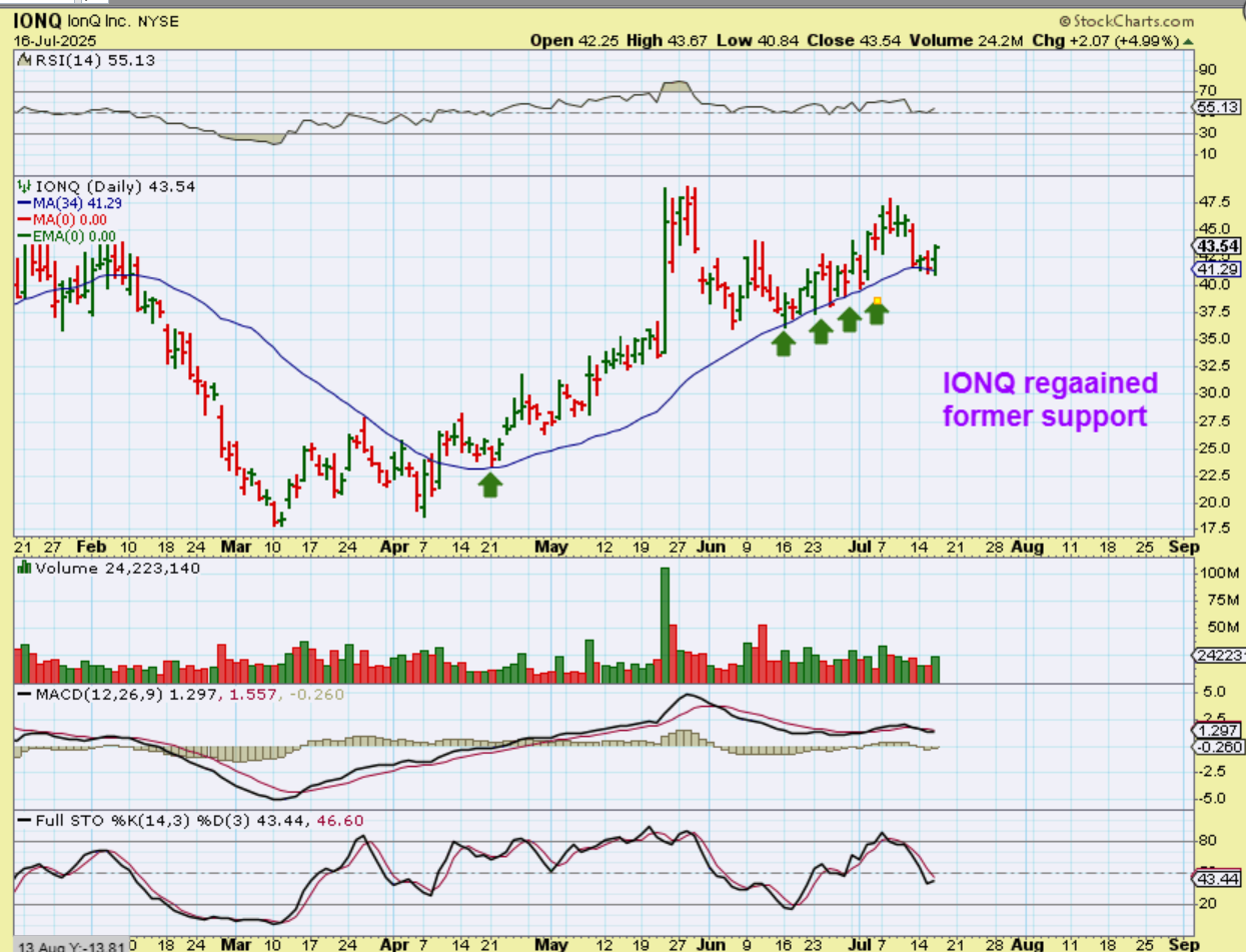 IONQ surged like RGTI back in May. Then falling to support, it gradually rode up the 34sma. Yesterday it regained it, so is it ready to run? This is an easy ‘buy’ with a stop.