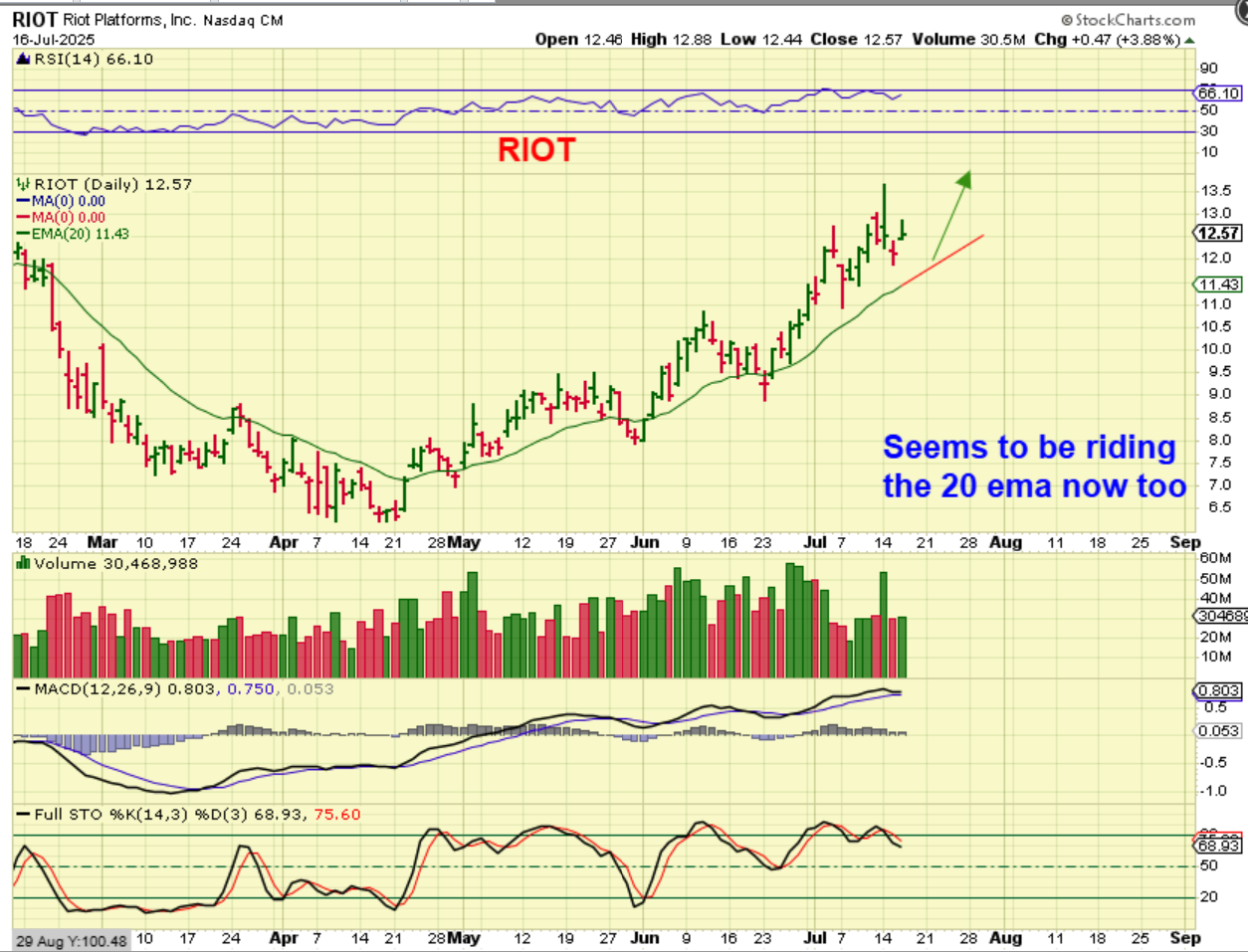 RIOT ran higher mainly in June, before Bitcoin surged, and then it peaked with bitcoin, so that was a strong run. It is now resembling Bitcoins climb along the 20ema with occasional small breaks & recoveries.