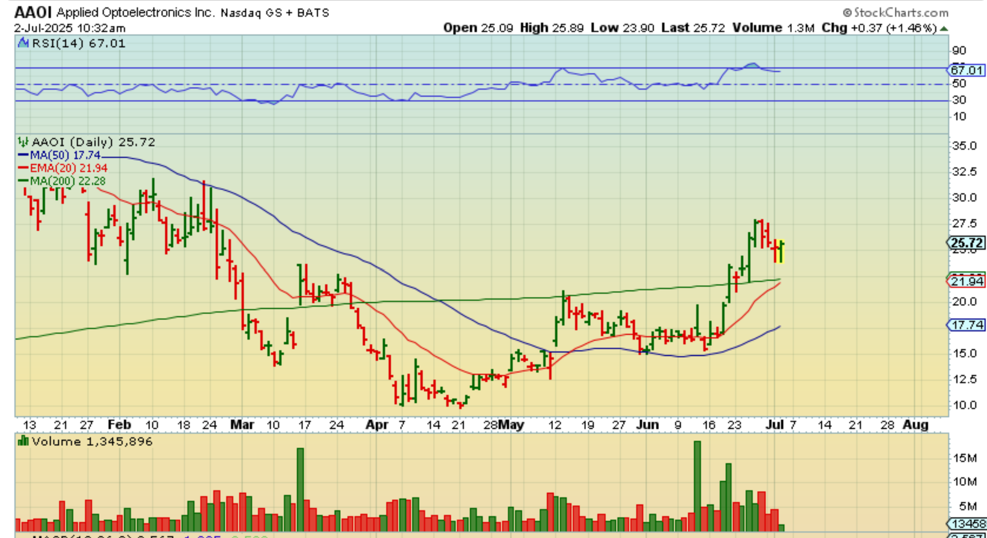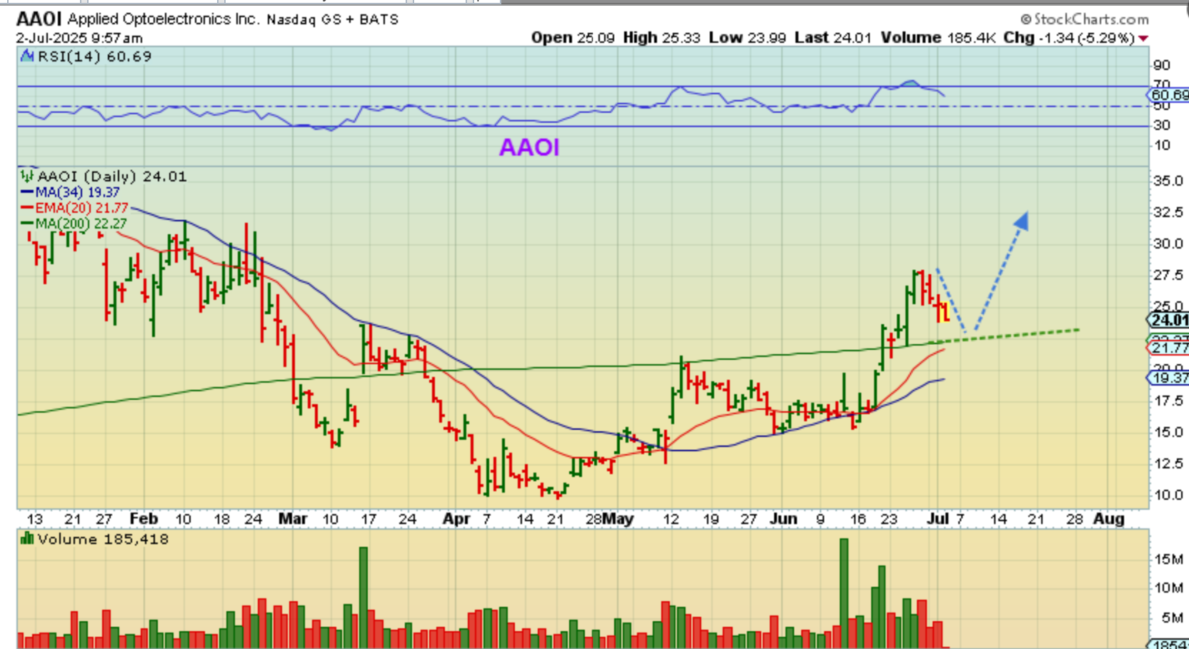 I was looking at another old favorite of mine, AAOI and I was pointing out that it could tag the 200sma as a buy. AS I POSTED THAT, it flipped higher, so…