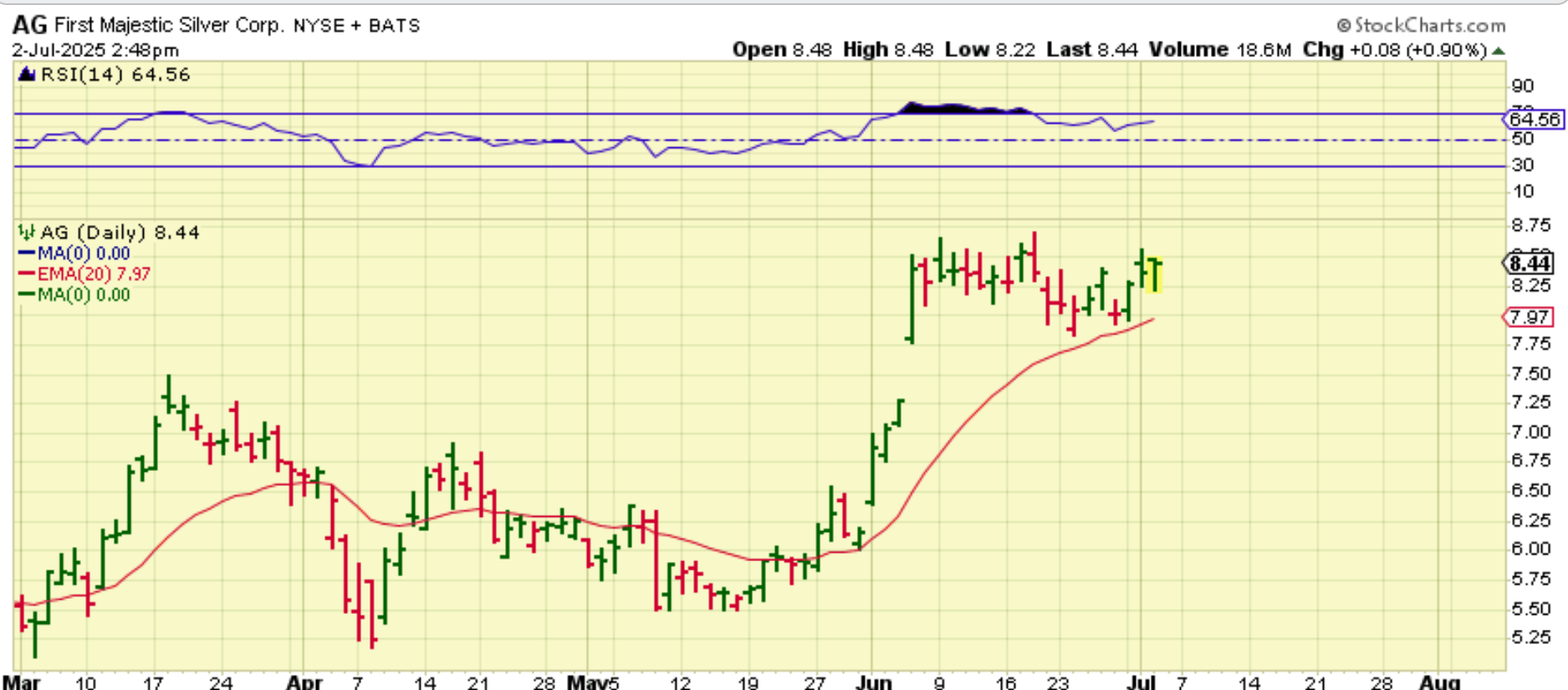 AG, EXK, CDE, etc sold off all morning and it looked bad. Ten after midday, they started to get bought back, and we ended the day with reversals to green for most of them. You can see that with AG here.