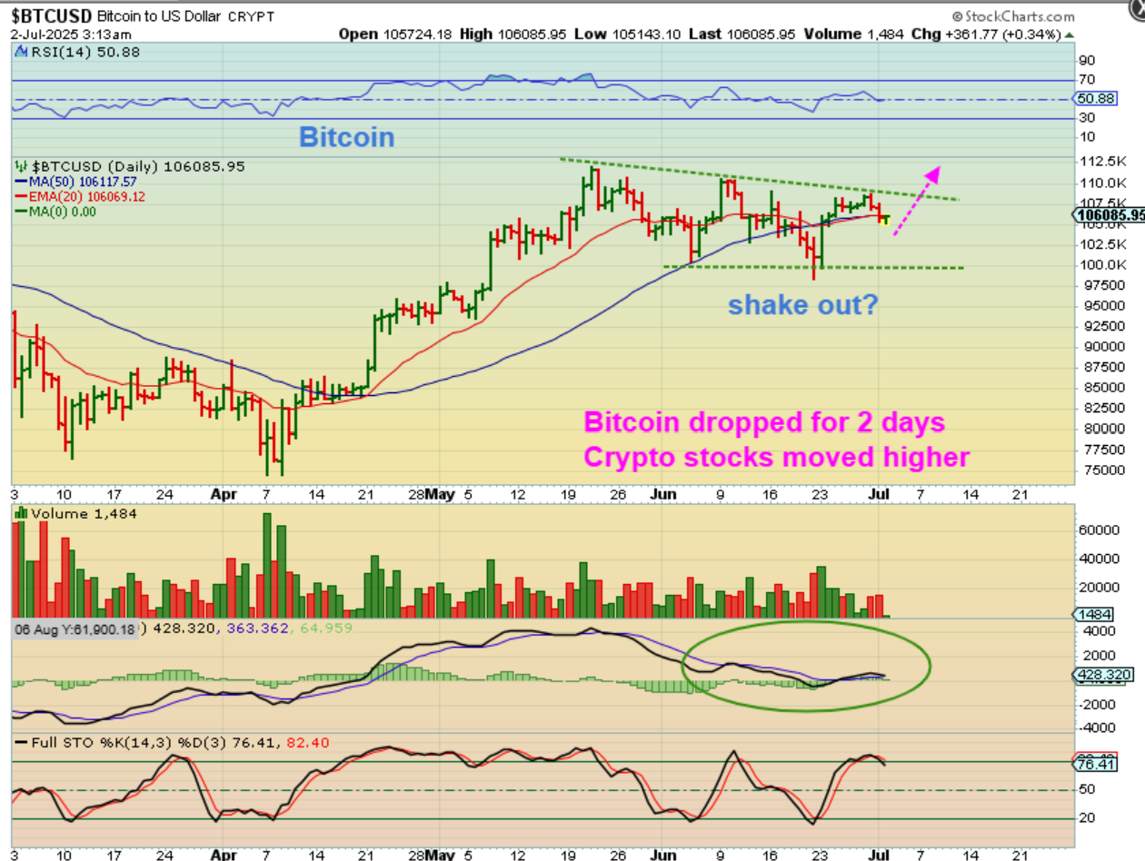 BITCOIN – If Crypto-Miners are leading, does this indicate that Bitcoin just did a shake out and this pull back may reverse early and break out? That is possible, because now this chop has allowed time for the MACD to stabilize and turn higher. Several Crypto stocks are running…