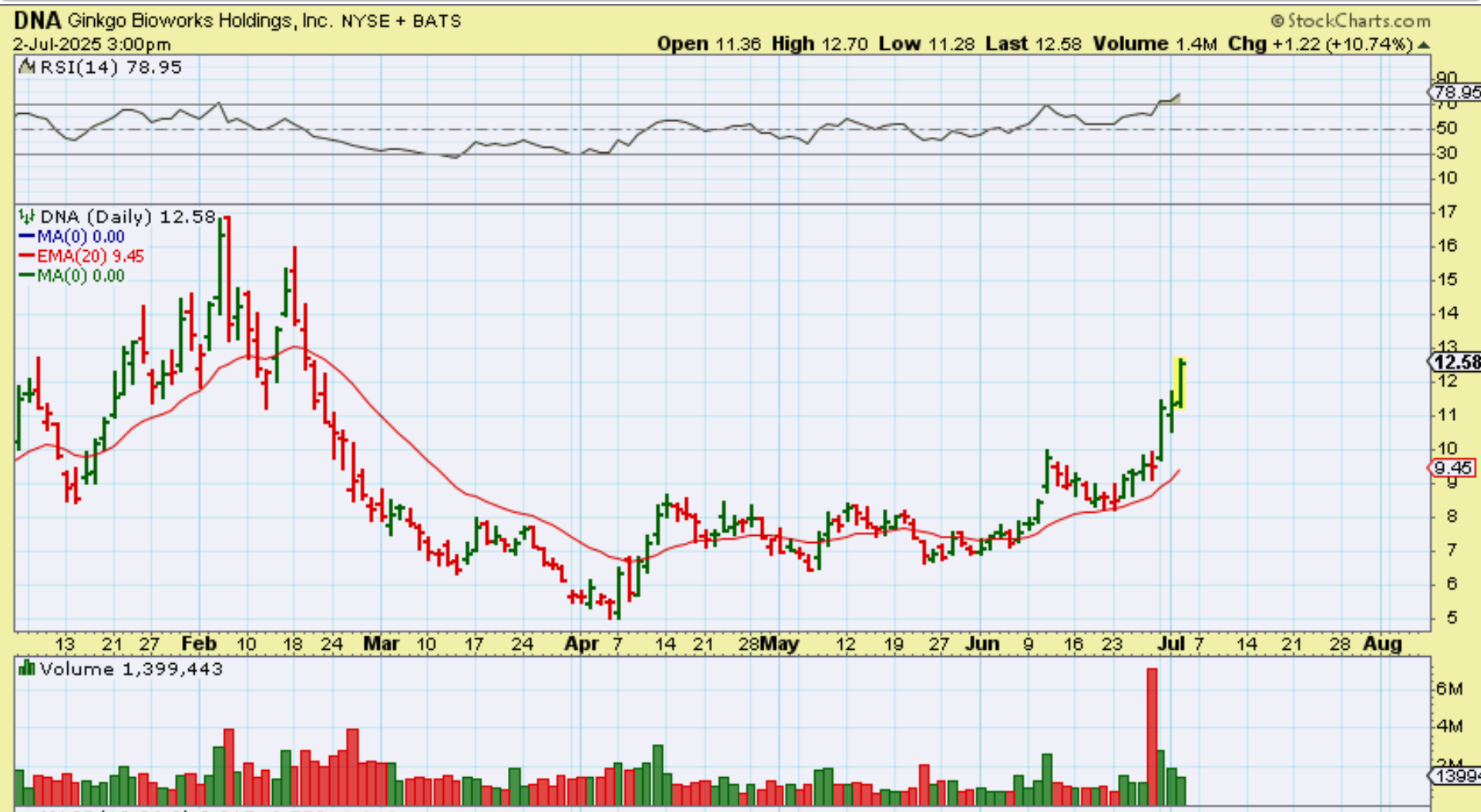 DNA was a stock pick from Monday that just keeps running after reversing at the 20 ema too. It was up over 12% at one point yesterday.