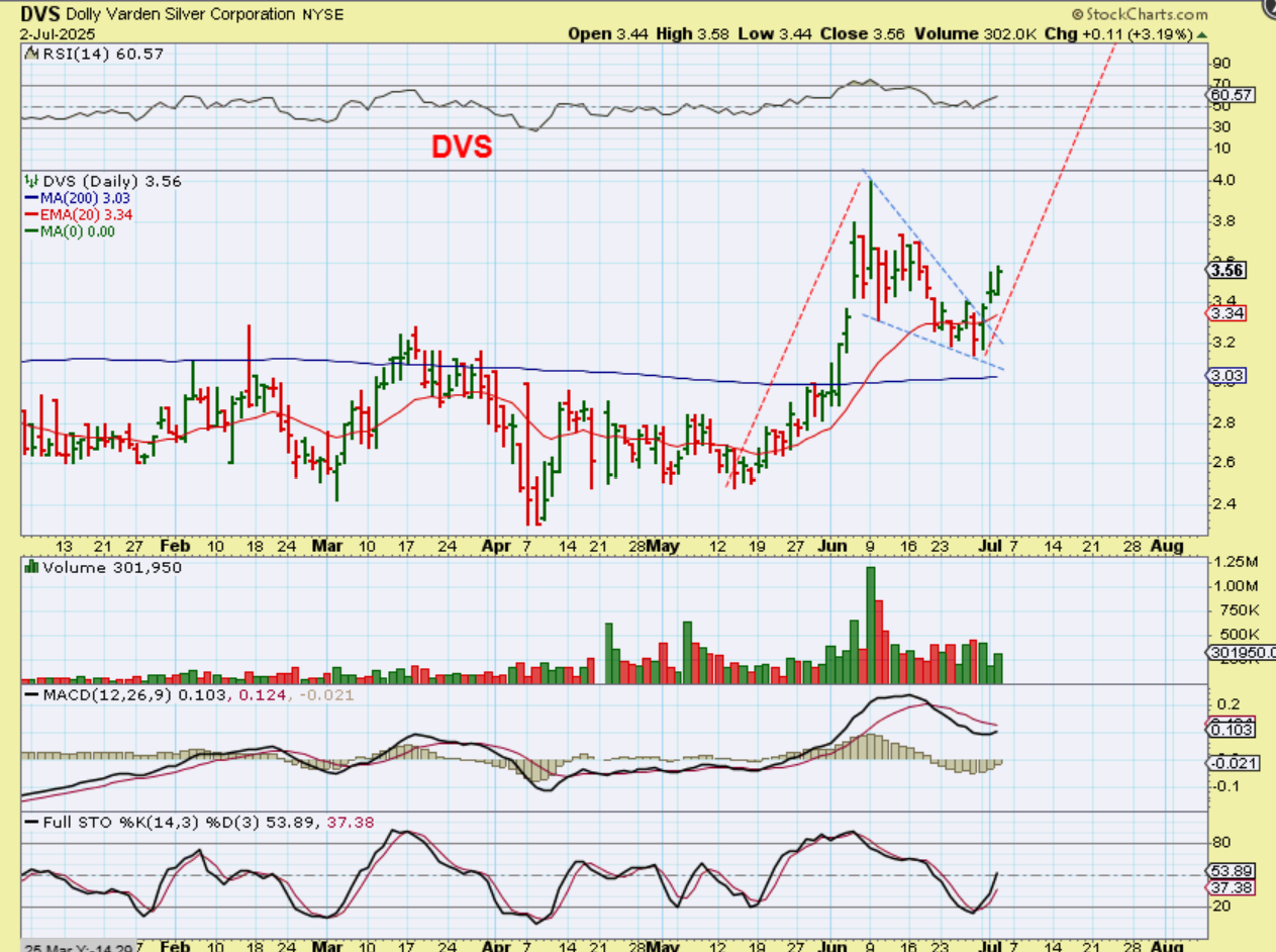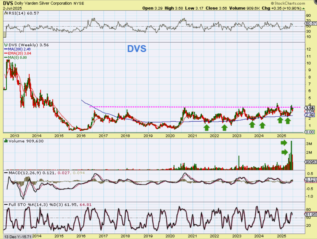 DVS Daily -had good news in May and made a run in May from $2.6 to $4. That is a good run & volume spiked. It then consolidated and an A-B-C up would lead to roughly $5, and this looks ready to go if Silver goes.  Then we take a look at the long term charts…