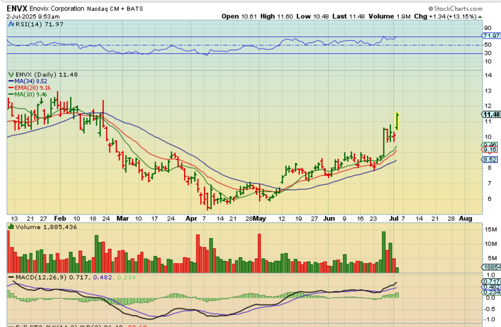 ENVX is still on the move. That was a large breakout above the 200sma (not shown), a bull flag, and then it started to go again. These set ups like to run back to former highs if the market conditions stay bullish.