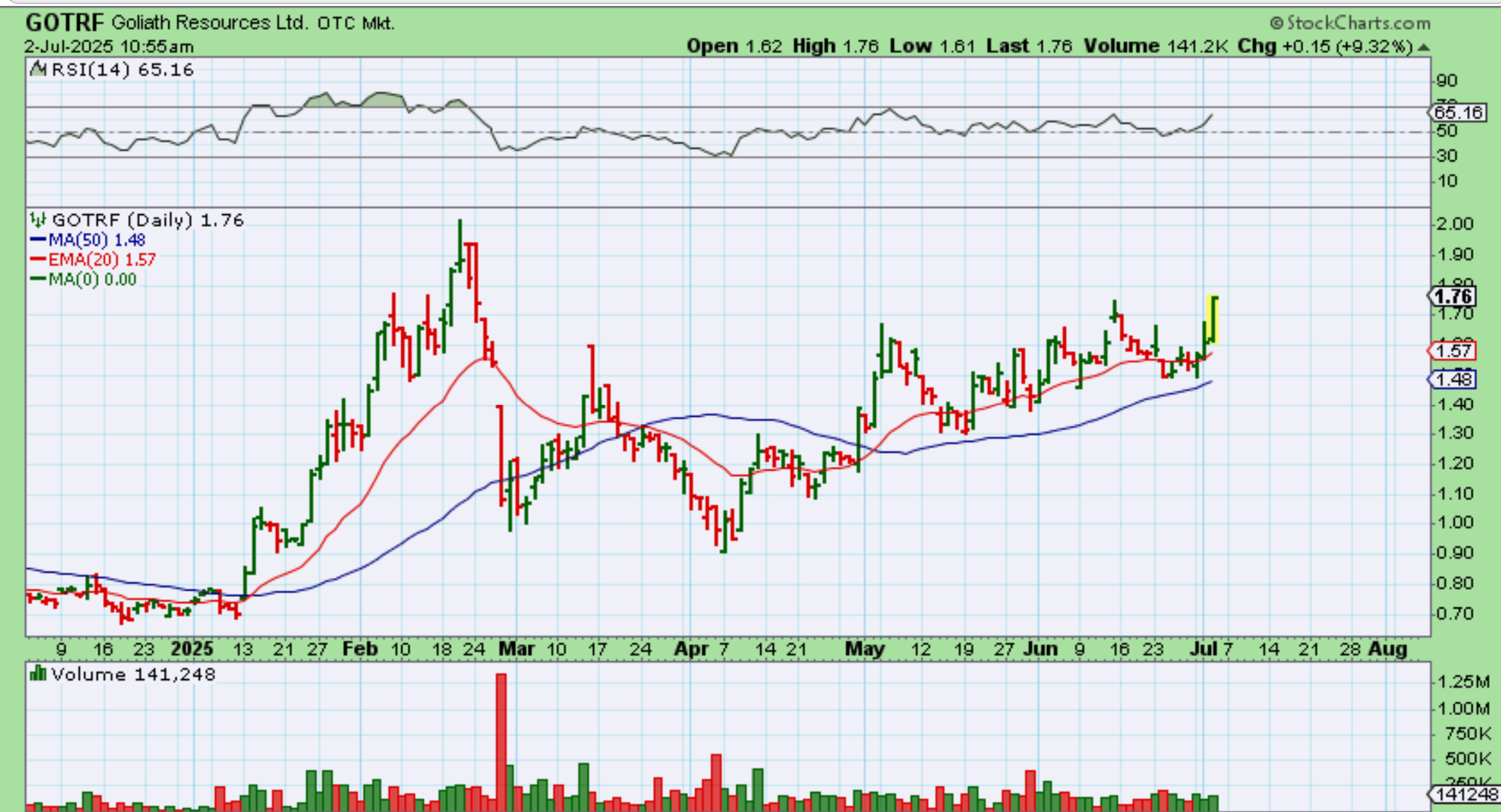 I also decided to run through some of the ‘5-letter’explorer/miners charts and GOTRF stood out as impressive recently. That is a 100% move since April, but the entire pattern remains bullish. It is choppy and that can be difficult, since it moves up and down by 5-10%, but buy a dip or start here with Silver starting a new Daily cycle.