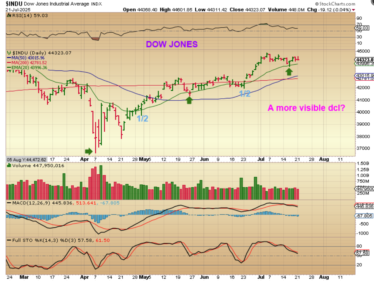 I saw that The DOW actually does look more like visible dcl. Looking at this, I can say that it does appear that a dcl dip took place, even though the SPX & NASDAQ just travelled sideways to the 20ema. Do you remember that I pointed out the quick 4 day drop in May as the last dcl (green arrow)? These are a testimony to the markets strength lately.