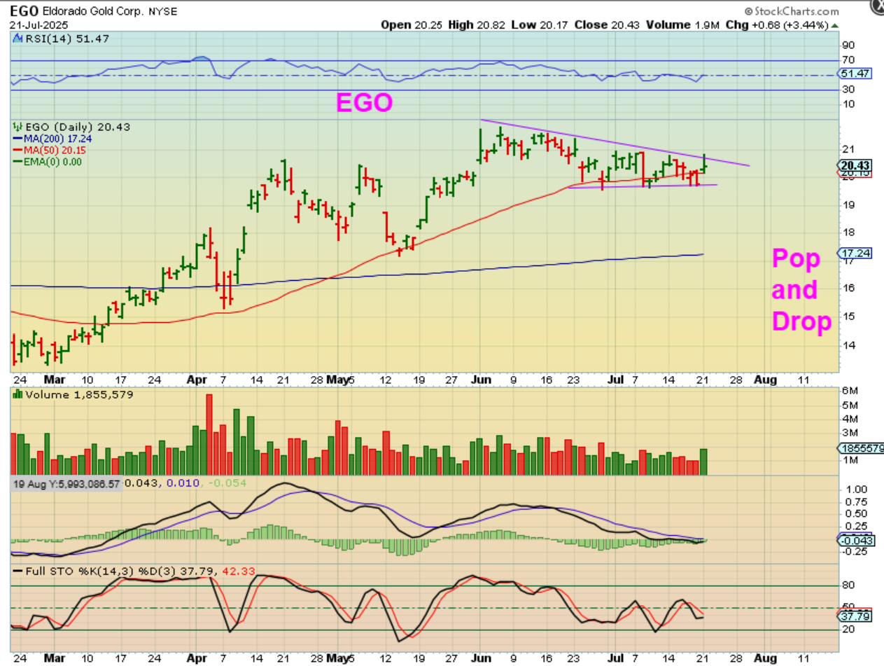EGO – Many Gold stocks also popped and sold off yesterday, like EGO. Again, it was up 2.44%, but it could have been up 6%, so it has me wondering if this daily cycle will peak sooner than later. For now, I would just ride them, and hope that buyers step it up.