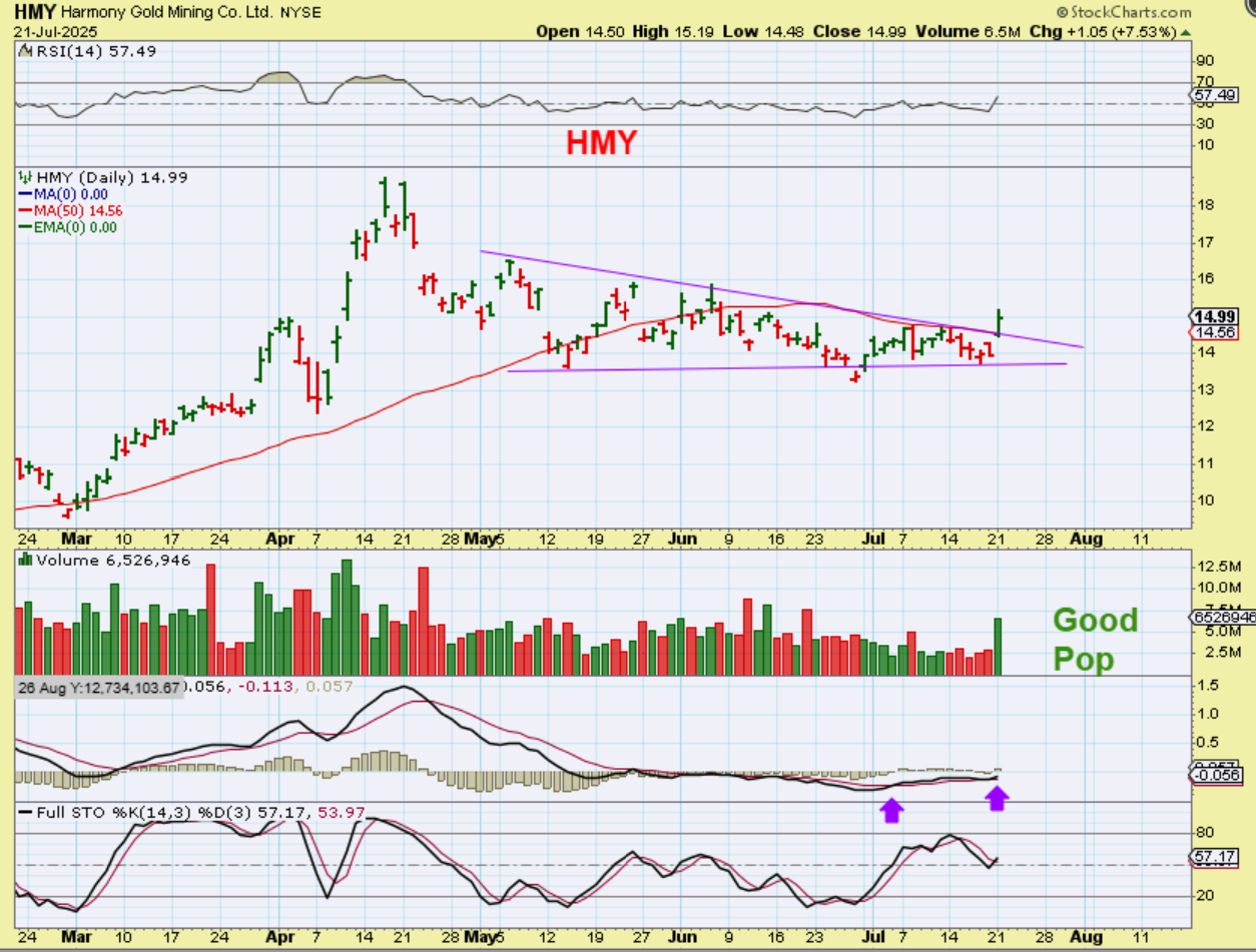 HMY had a nice 7.5% gain yesterday as it breaks from a long consolidation under the 50sma. Honestly, this chart looks very good and I would expect a run to the recent highs if Gold stays bullish.
