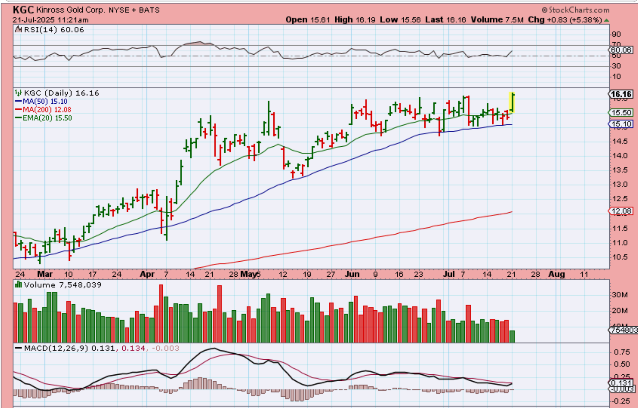 KGC popped 5.38% to new highs, so I posted this chart at 11:20 a.m. It then became one of those Pop & Drop, so you can now buy it at the closing price of $15.92. (It is $15.80 in pre-market)