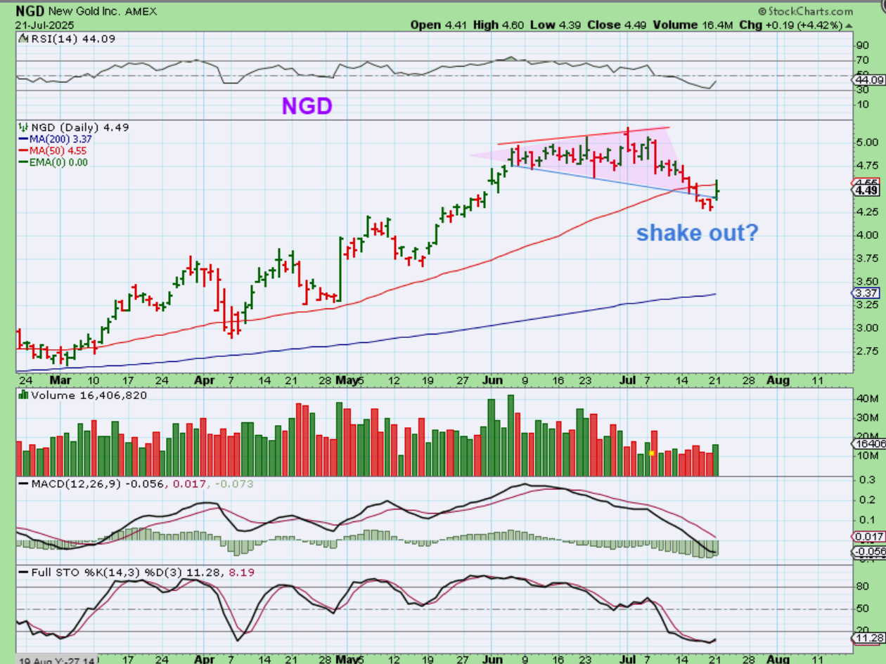 NGD was one of my favorite Gold stocks and I mentioned it several times over the past 2 months, but I got stopped out in the $4.75 area. It has now lost the 50sma and may try to regain it (as a shakeout?). It did a pop and drop yesterday too.