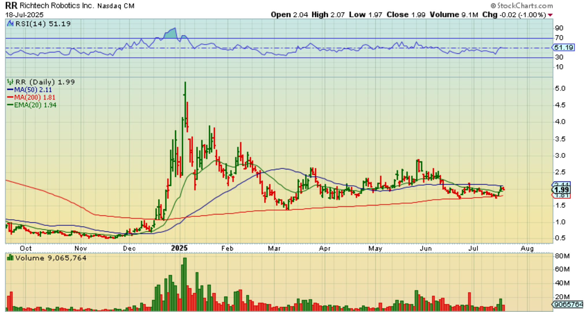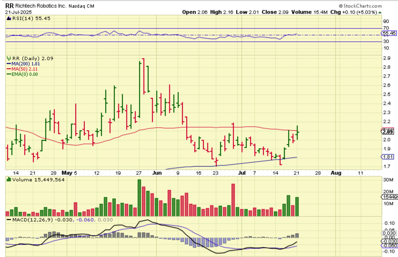 RR broke out and then dropped again. It is, it is actually at $2.09 right now, under the 50sma, so it can continue to chop along under the 50sma and above the 200sma, or it may break out, but the set up is good.