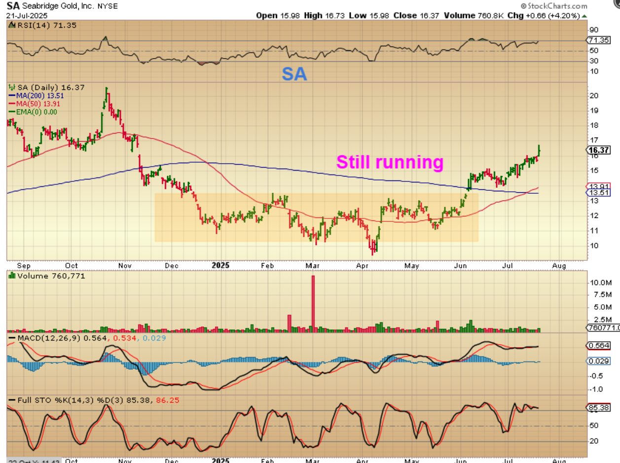 I had pointed out SA as a lagger in a nice base, and it broke out in June and it has also continued higher despite Golds choppiness. So some Miners will perform well despite the choppiness and actually some of the 5-letter runners are doing well, because they lagged or did nothing up until now