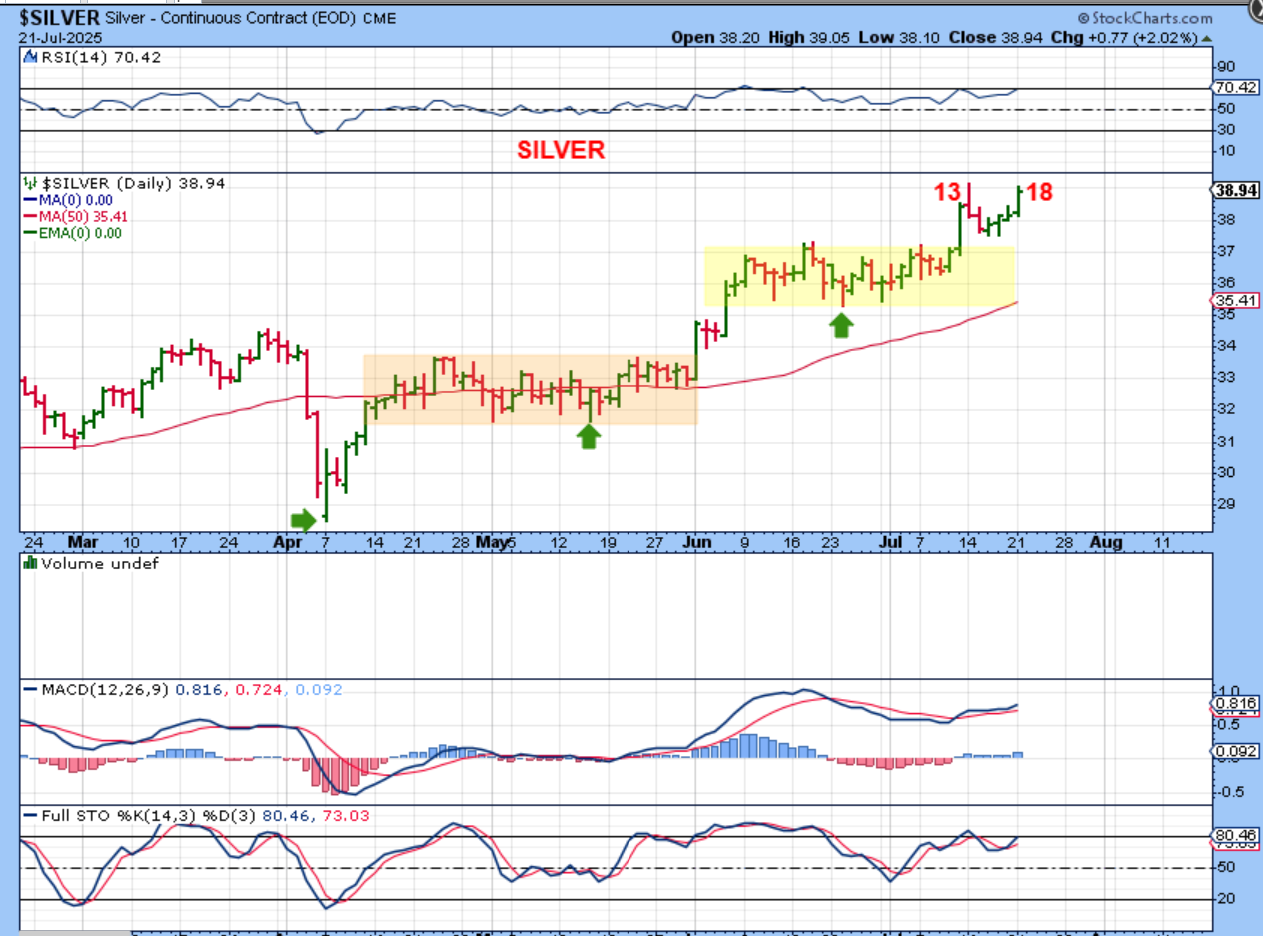 SILVER popped and almost made a new daily cycle high at day 18. SILVER CLOSED NEAR THE HIGHS.