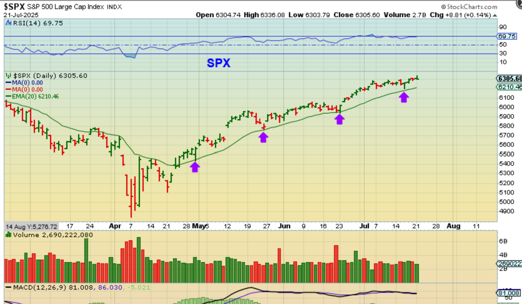 SPX – The general markets did another pop and drop, and my account went from nicely up at the open to fairly red at the close. Some of what I own (Robotics, quant stocks, Nuke stock, AI stocks) exaggerated the moves, but the charts remain bullish. I have mentioned that it is too hard to tell if that drop at the last purple arrow is a dcl following that long consolidation, but I thought of something else…