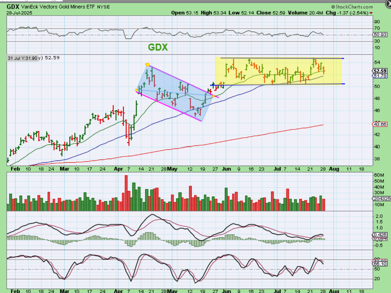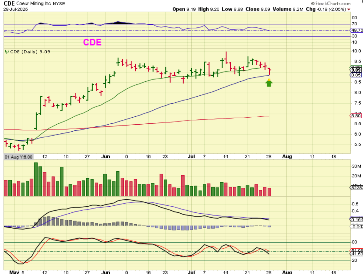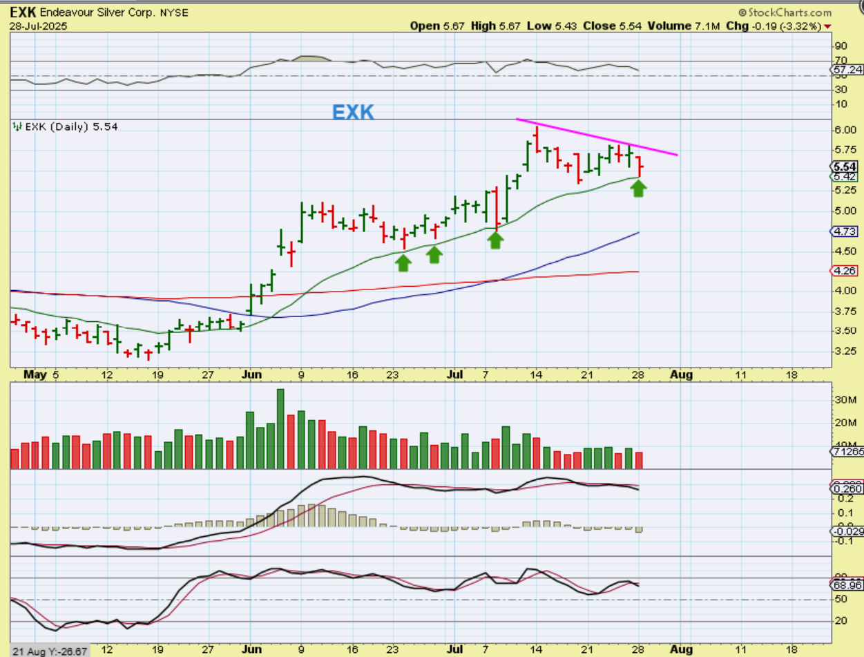 I have a small surgery scheduled for Tuesday morning (Laser blasting & removal of Kidney Stones), so I won’t be around for trading. Not much changed on Monday, but the USD did surge with trade deals and discussions taking place in the EU. Most of the stocks that I owned did dip lower, but it was minimal and then they started to bounce back. Silver stocks also bounced off of the 20 ema, so the selling seems minimal for now. Let’s look at the charts…