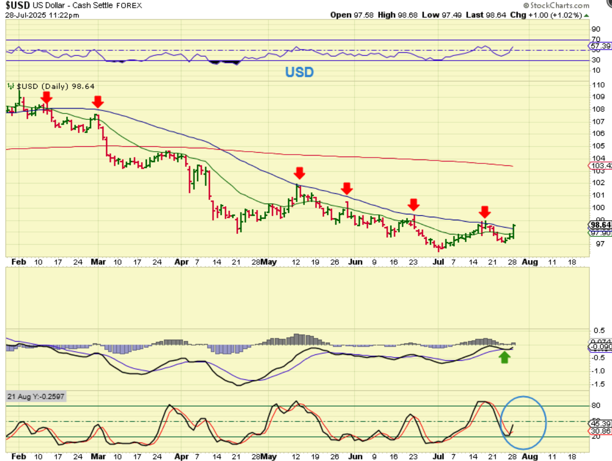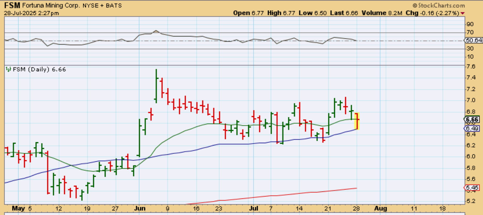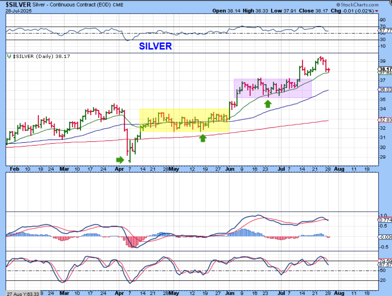 I have a small surgery scheduled for Tuesday morning (Laser blasting & removal of Kidney Stones), so I won’t be around for trading. Not much changed on Monday, but the USD did surge with trade deals and discussions taking place in the EU. Most of the stocks that I owned did dip lower, but it was minimal and then they started to bounce back. Silver stocks also bounced off of the 20 ema, so the selling seems minimal for now. Let’s look at the charts…