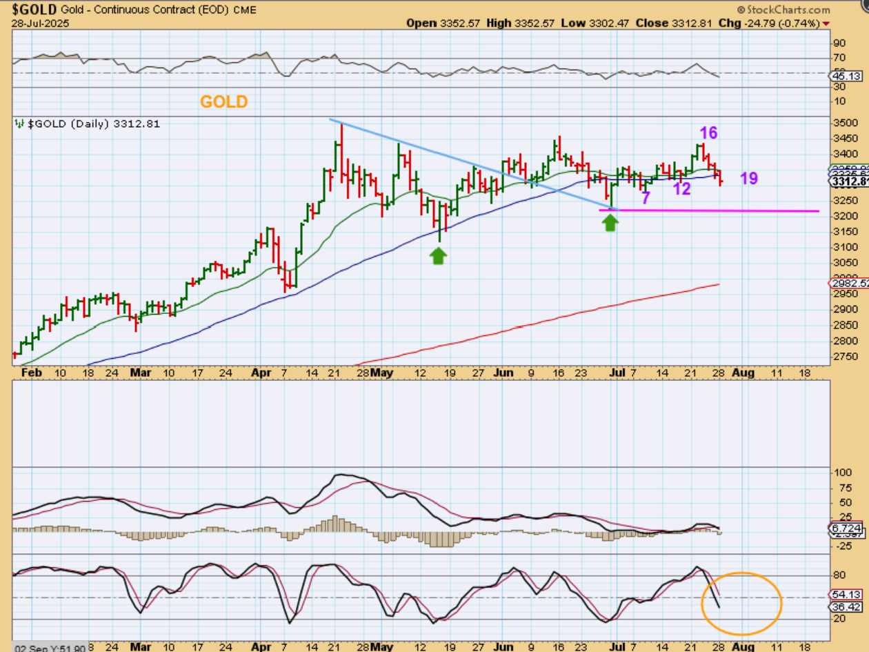 GOLD did drop and may be in the dip to find a dcl. I don’t want to see the magenta line broken, or we have a failed daily cycle, so I’d like to see this bounce into the Fed Wednesday period and then sell off to a low by day 25 or so. We’ll just have to wait and see, but it does look like it’ll be R.T.