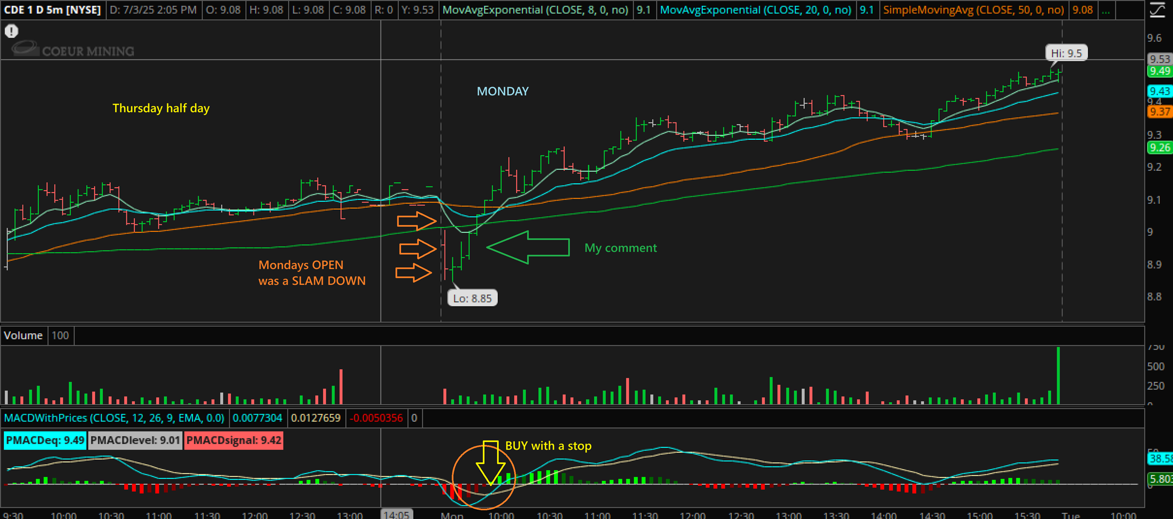 And I mentioned it there at 10 a.m, because this was what I was seeing after the slam down open in all of the Silver Miners. The Green arrow was the buy, using a stop just in case it sold off later.