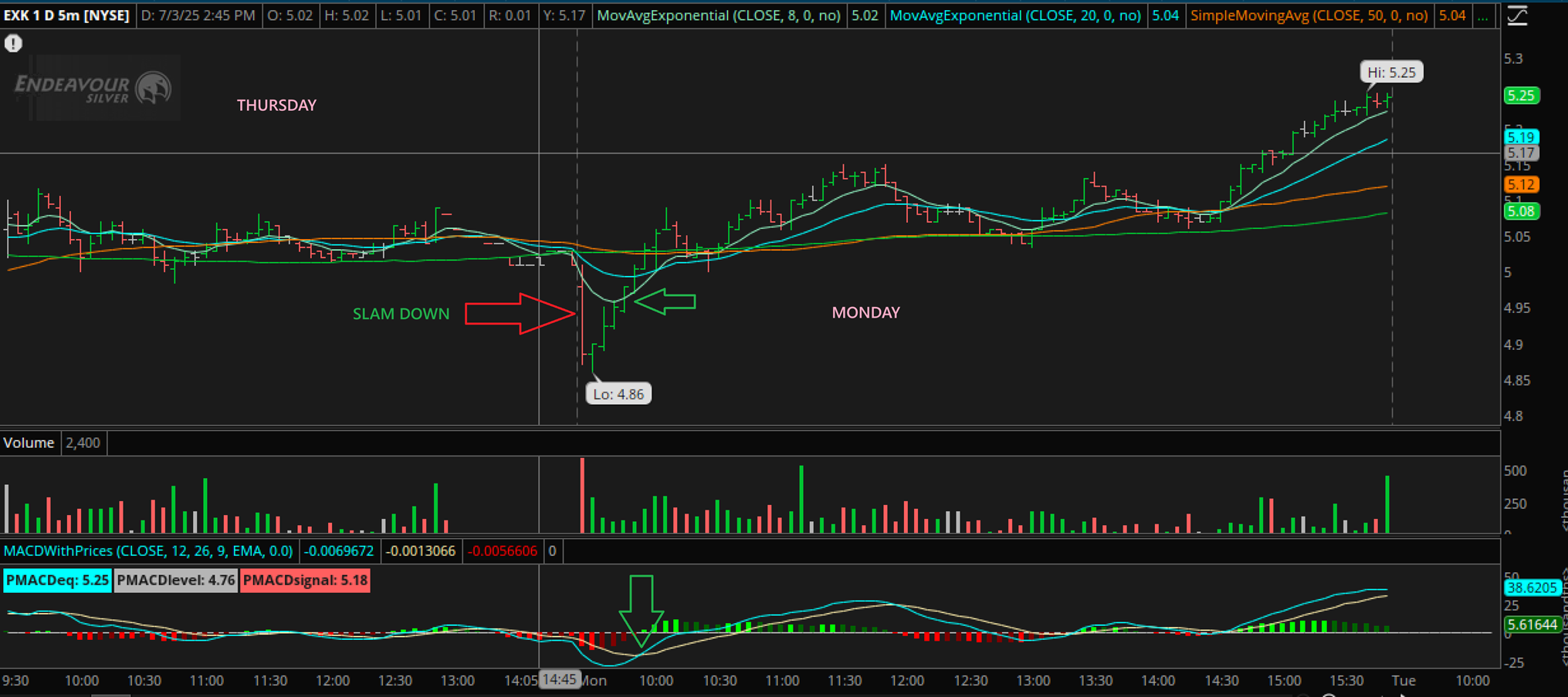 EXK – And that reversal that we saw intraday after the slam down for EXK? This is the daily chart of a false slam down and recovery.