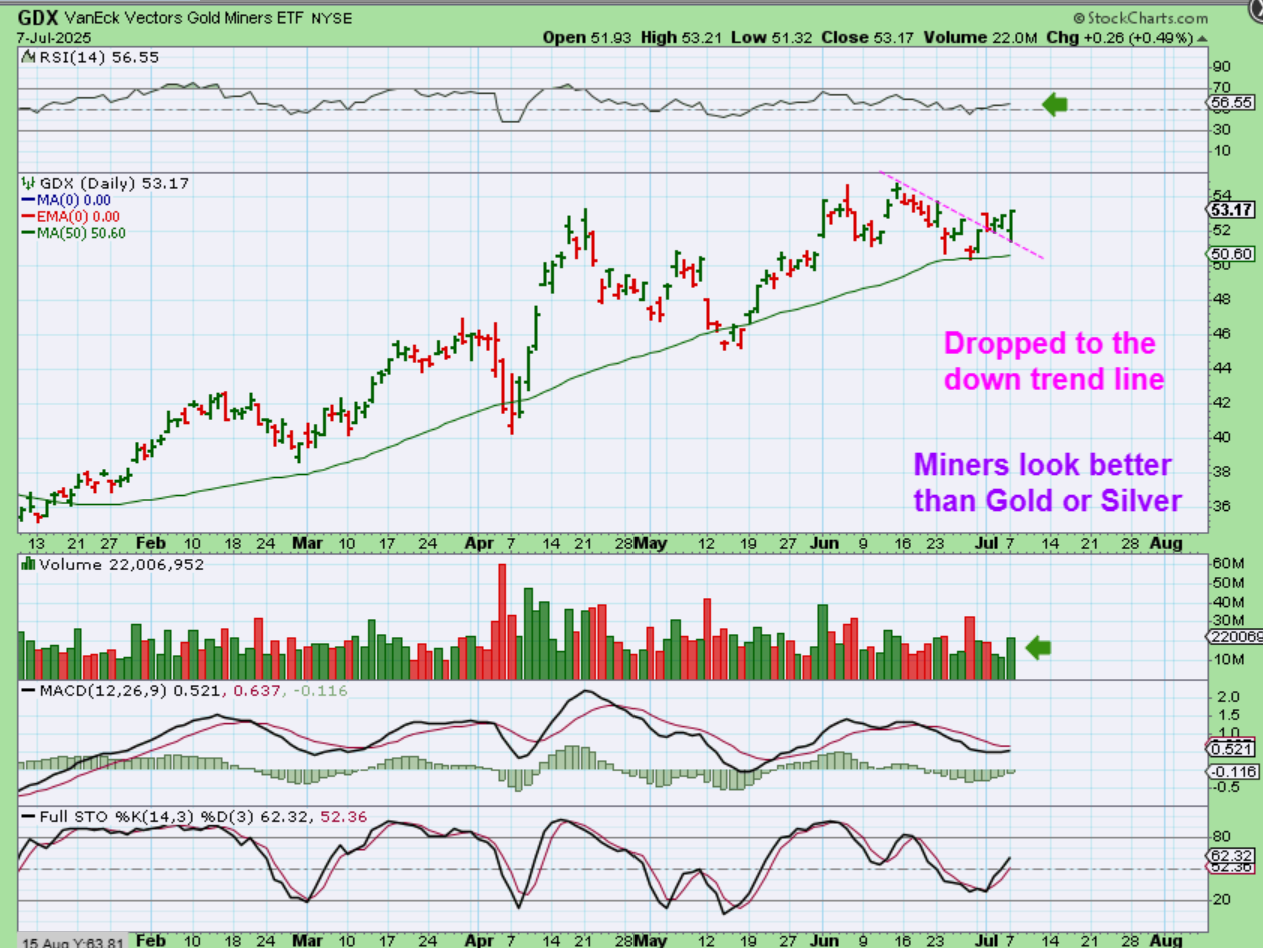GDX lost the 50sma at the last 2 dcls (it did ‘shakeouts’). This time it held up better, since it bounced off of the 50sma and broke a downtrend line too. It dropped and back tested the magenta trendline on Monday, but buyers stepped in and it closed Green. Some Miners are outperforming the metals and that is encouraging (Surprises to the upside, like NAK. NAK was up almost 30% on good news pertaining to the EPA).