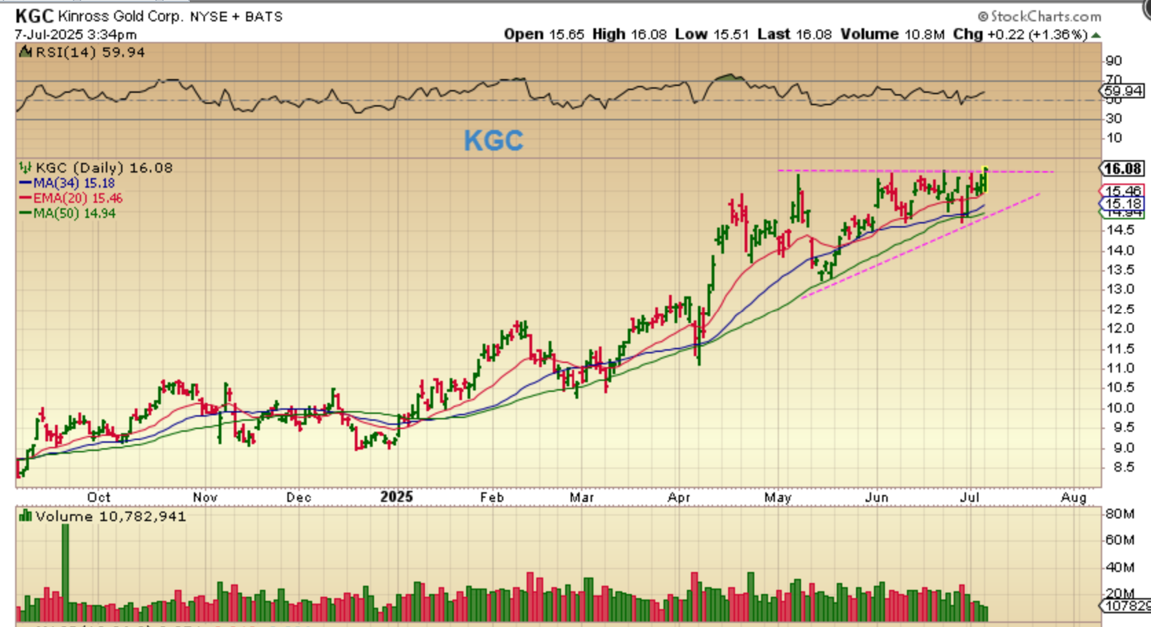 KGC is a bullish rising wedge that we would expect to break to the upside.