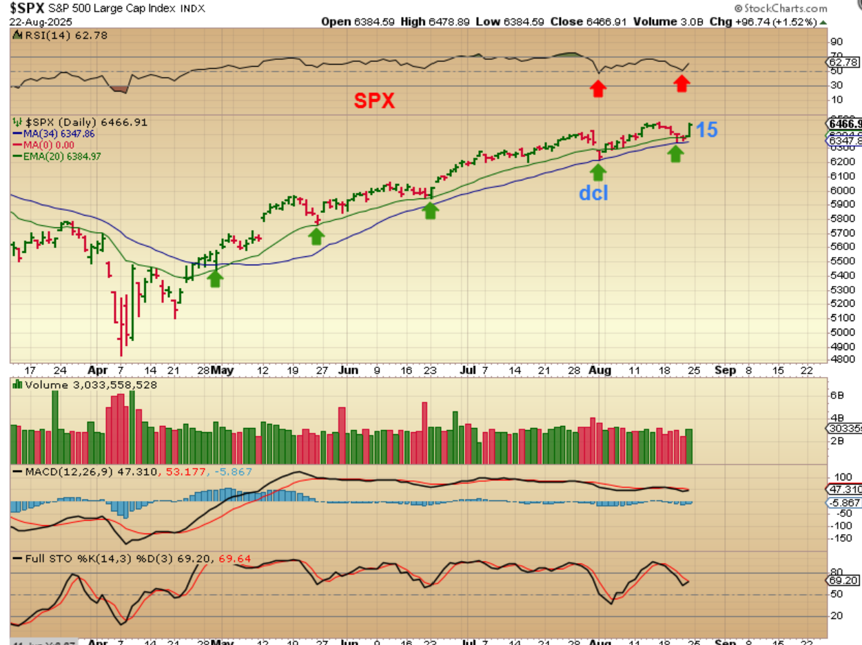 Using a daily chart we were on day 15 Friday when The SPX was on support awaiting the Fed Speech from Jackson Hole. After basically guaranteeing a rate cut in September and maybe another before the year ends, all of our bullish sectors took off higher and closed near the highs of the day. This is a beautiful chart and the markets should continue higher next week.