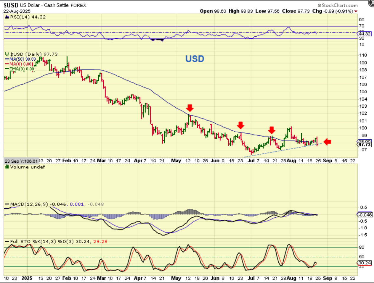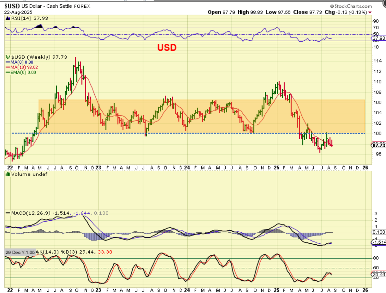 USD WEEKLY – The USD lost support, ran up and back-tested it, and then dropped without a recovery. It still has not been able to recover that area.