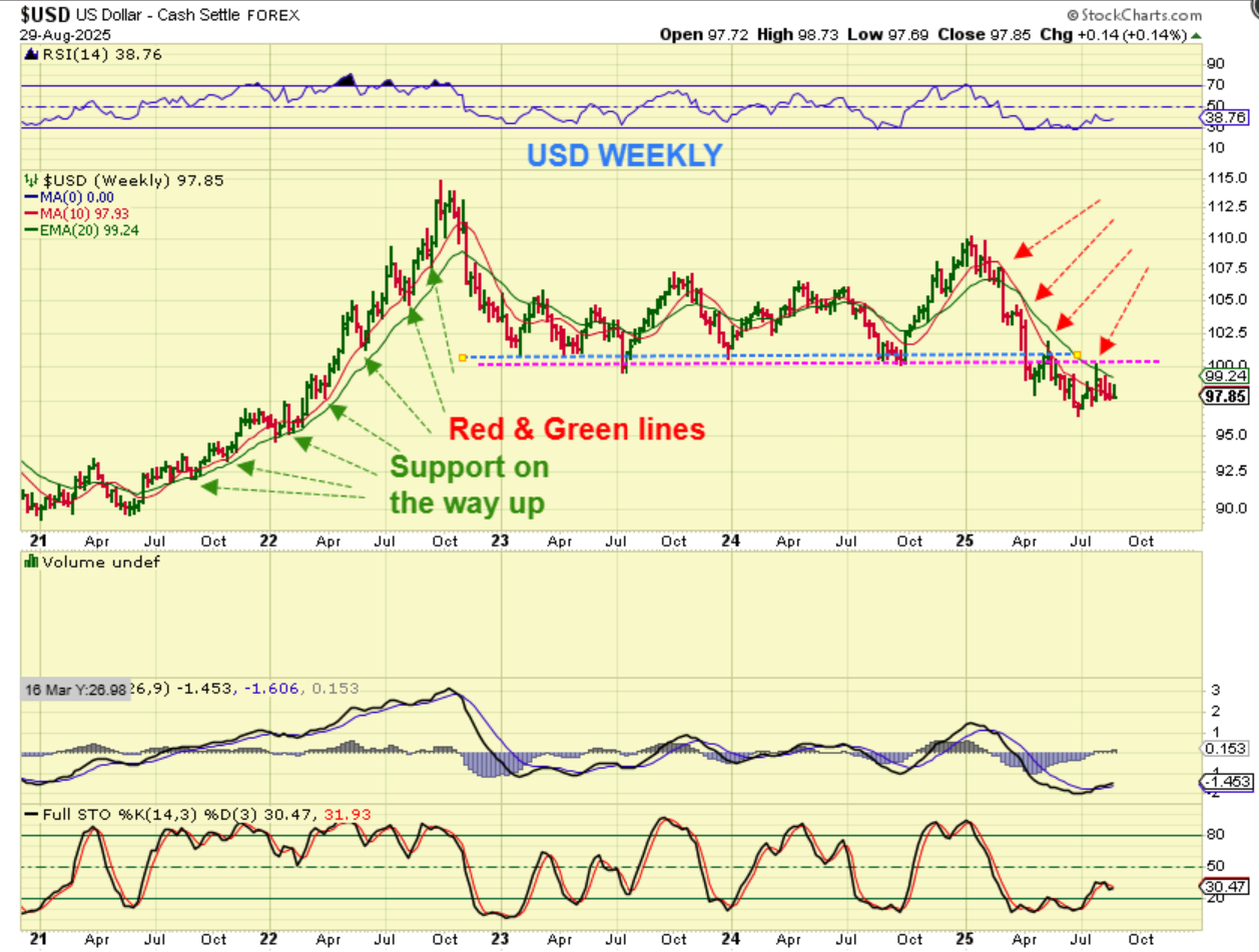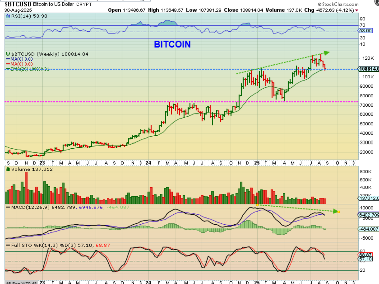 BITCOIN WEEKLY– The weekly chart has Bitcoin back testing a breakout and back testing the green 20 weekly MA. THIS doesn’t look as concerning as the daily cycle count, but we need Bitcoin to move higher next week in my opinion.