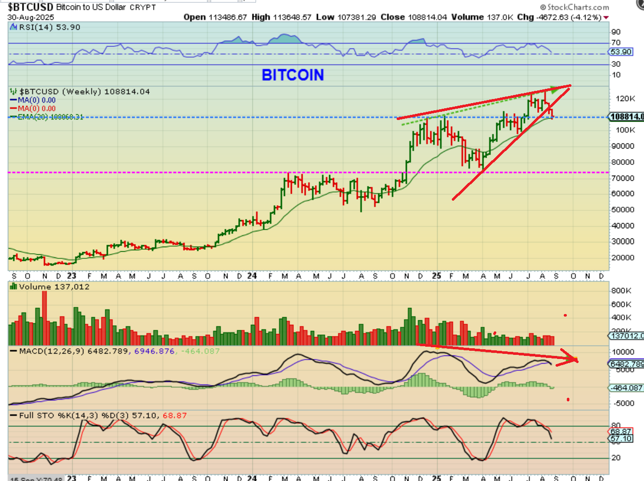 BITCOIN WEEKLY– This bearish rising wedge breakdown and a MACD cross under would make the weekly chart look bearish too, however.