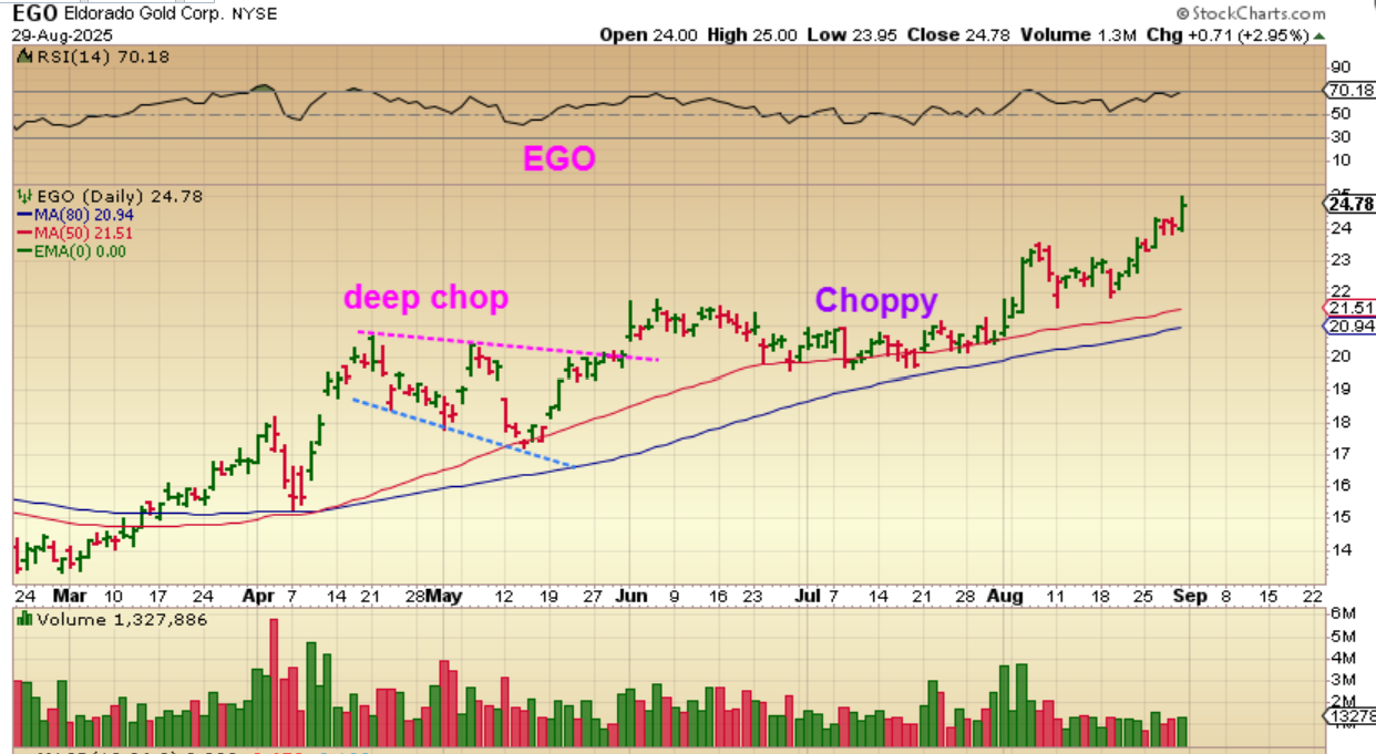 So we’re discussing these choppy daily charts. It can make the ‘buy and hold’ very difficult at times, even a little boring. This little lesson is always a good to one review though, and you’ll see why. Let’s look at EGO: One of the Gold stocks that I really liked along with KGC, IAG, NGD, etc.