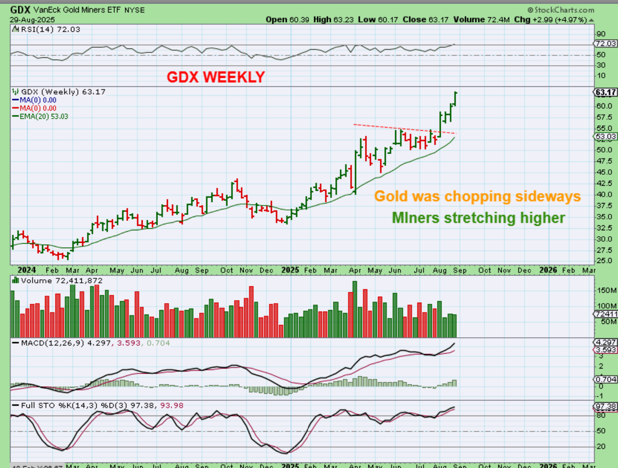 You can see that GDX has been leading the way and not following Gold over the past couple of weeks. Miners kicked it into gear over the past couple of weeks in August.