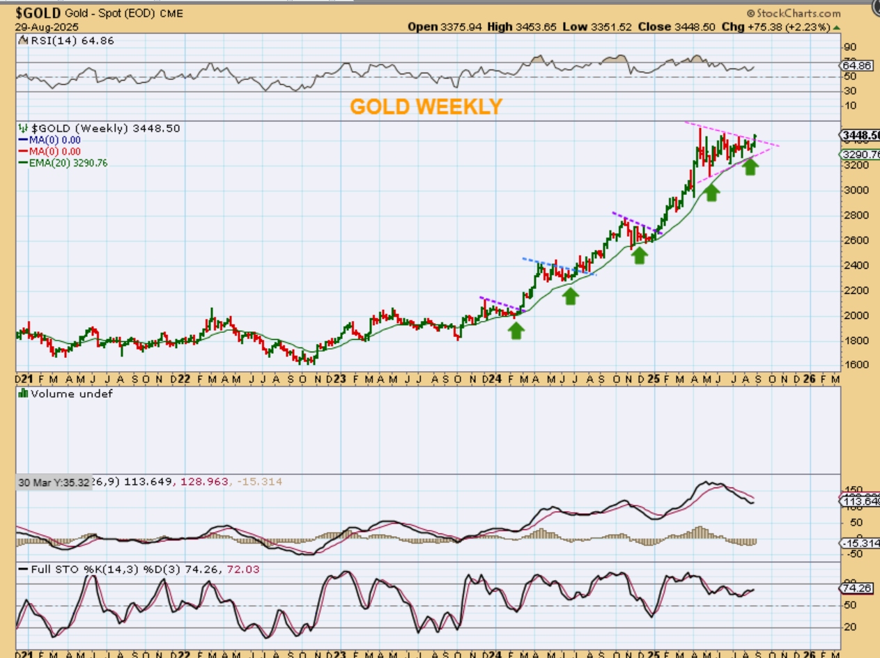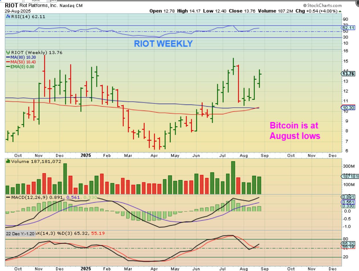 But then we look at weekly charts of some crypto stocks. Bitcoin was selling off in most of August and is at the recent lows, yet some Crypto stocks are running ahead higher. Is this similar to the Gold Miners running when Gold was only chopping sideways in a triangle?  Tiem will tell, but lets look at a few charts…
