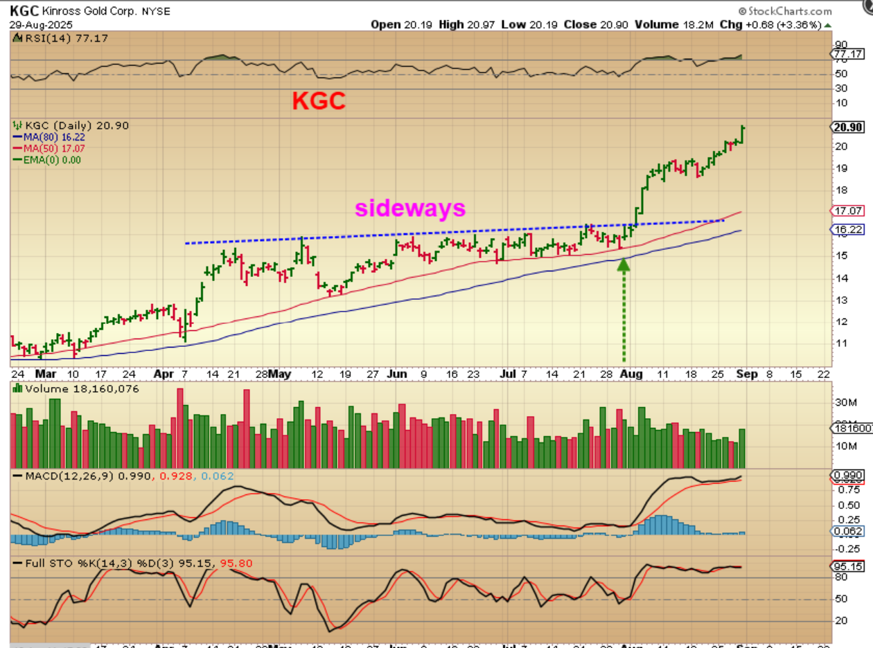 KGC was one of my favorites and look what just happened in August! This was another choppy sideways move, but it was upward chopping. Well, once it finally broke out, it just ran like a cheetah! Some others that I am discussing may do this too, when Buyers decide that they want in.  What does THE KGC WEEKLY chart look like?…