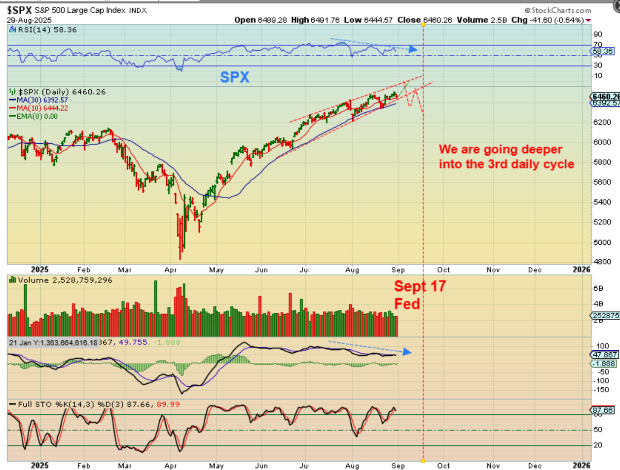 The markets remain bullish, and the count is only about mid-way through the 3rd daily cycle. It could be a 3rd of 4 or even a 3rd of 5 daily cycles, so this can just continue higher.  But what if we DID get a dip into an ICL end of September or October? It may be mild like this.