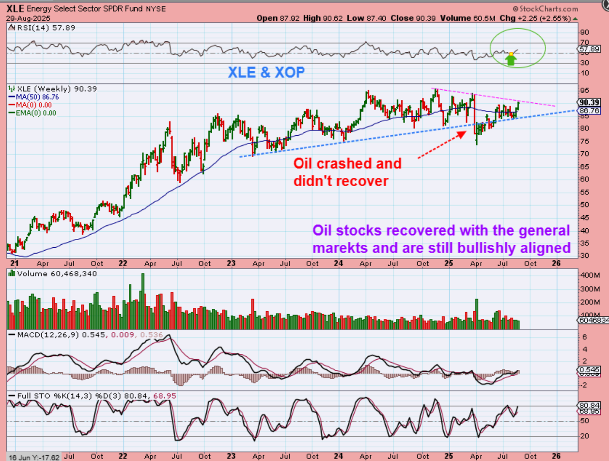 Oil broke down and has not recovered, but THE XLE crashed in April and then it gradually recovered. Over the past 2 weeks it has perked up. Pardon the typo on the chart.