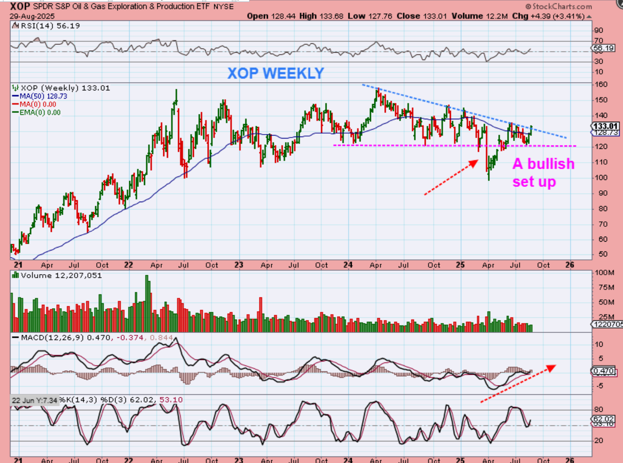 THE XOP has a bullish looking set up too. This resembles a shake-out and it has moved to the upper trendline of a wedge.  So Oil stocks actually look good again, with Oil still yet to recover the loss of support.