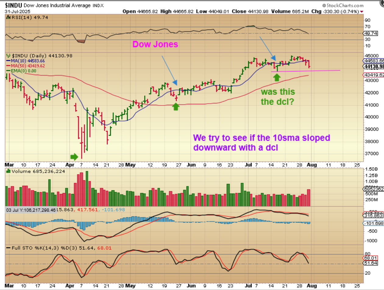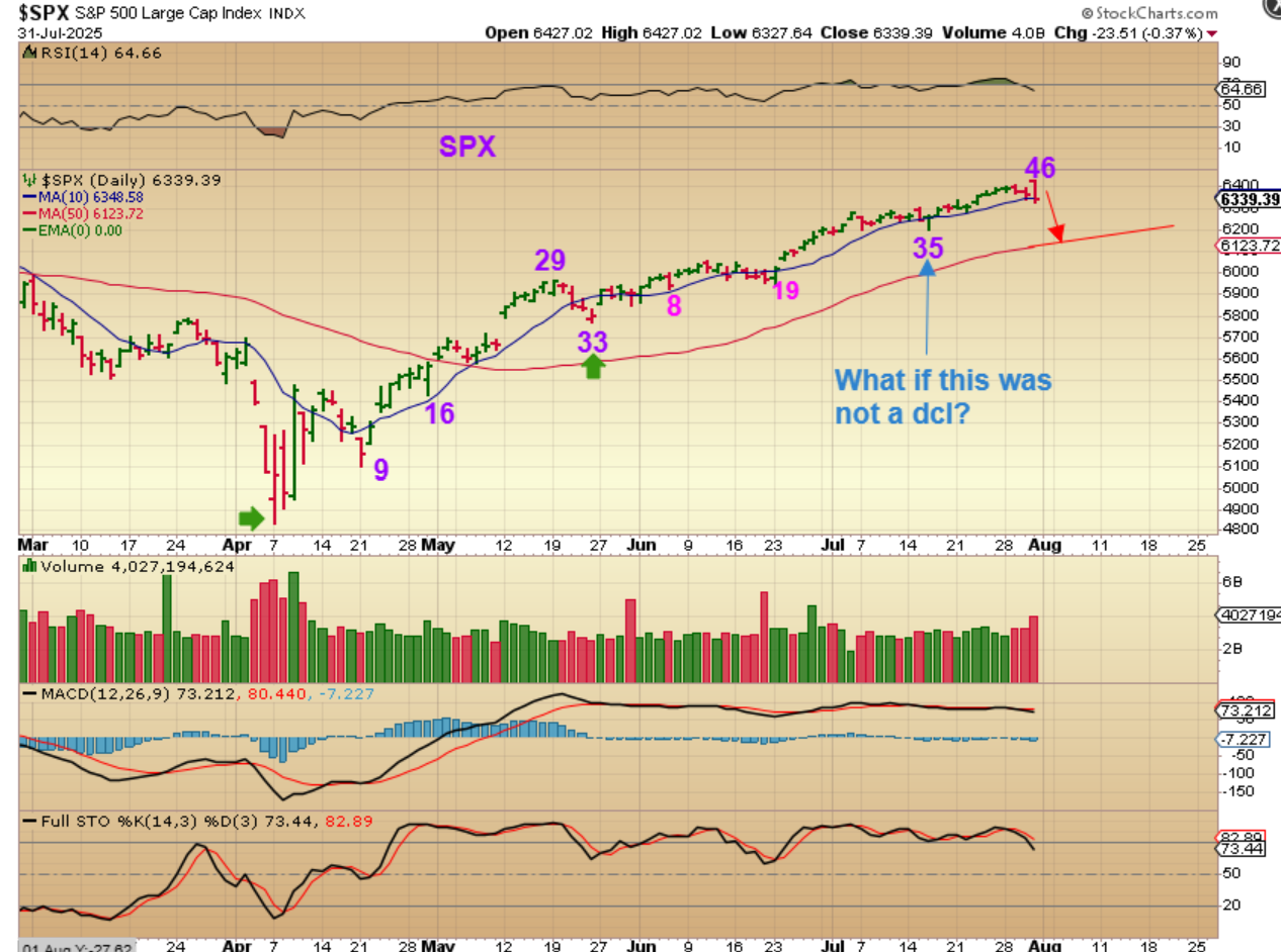 I marked up a day 33 low as the dcl in May, and then we saw a very mild chop & tiny drop & recovery at day 35 and that was marked as a dcl, based on the way you could see it better with the Dow. When I look at this however, it is within the timing for a dcl, but was it? The SPX certainly doesn’t strongly resemble a dcl at day 35 and we have had dcls come at day 50 or so in the past, so it really makes me wonder:  IF THIS LOW IS TAKEN OUT, does that give us a failed daily cycle or an extended run to the real dcl?  We MIGHT really be on day 46 as of yesterday as shown here.