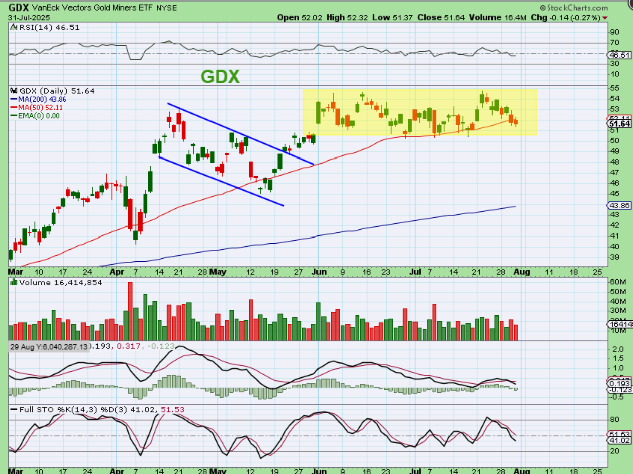 GDX is choppy and has been churning sideways like Gold. I feel that it is this choppy, partly because we have a mixture of GDX following Golds selling, and also GDX reacting bullishly to good earnings reports by some of the Miners like NEM, KGC, NG, etc.