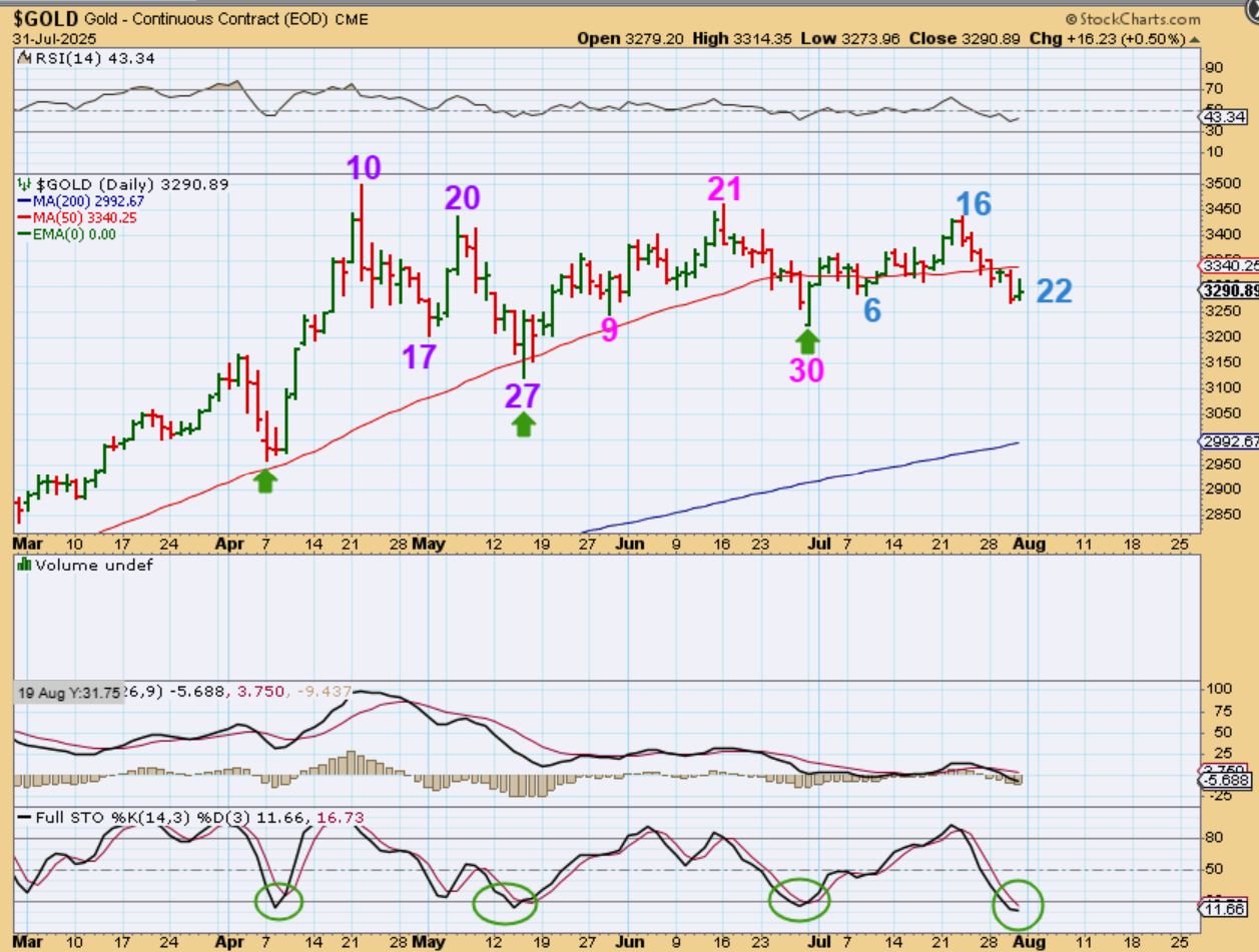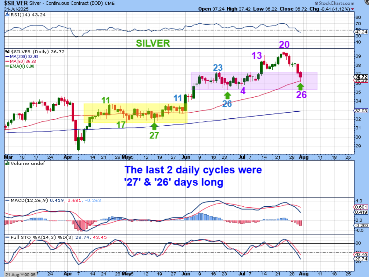 Now GOLD is on day 22, so it does have more ‘time’ available before putting in a dcl, right?  The question that remains is, “What will Gold do during that remaining time?’. It can bounce & chop around and hold up well, or it can sell off into a low, so we just need to be aware of that. A break of the last day 30 low is a failed daily cycle and starts our drop into an ICL.
