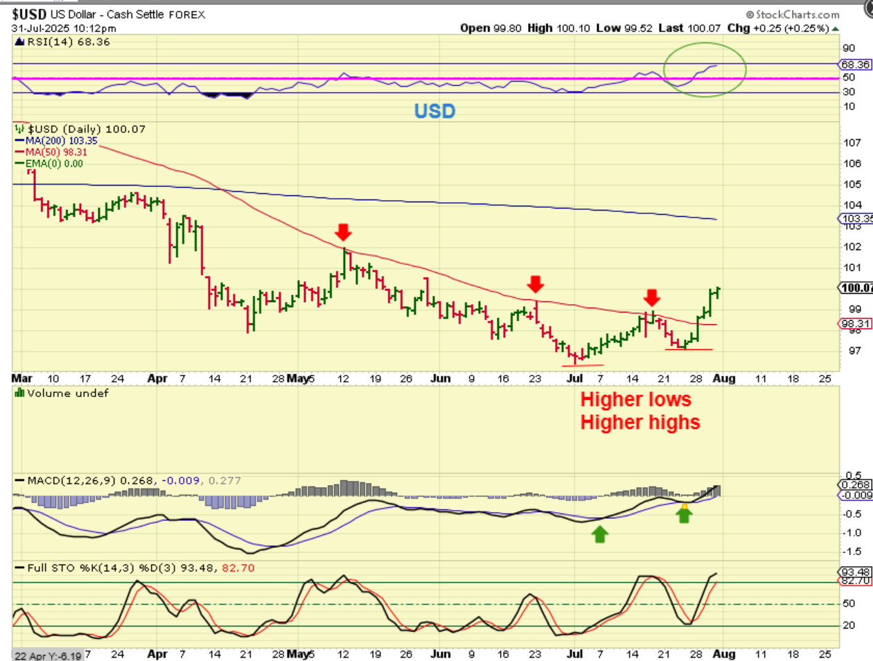 The USD has a higher low and a higher high, the MACD showed us strength weeks ago, and now the RSI is at a height that it hasn’t reached for 7 months. This should be able to make its way up to the 200sma, and that might be the ‘peak’, or it may continue to show strength after that. I will discuss the possibilities in the weekend report.  We now have daily, weekly and monthly charts with the end of July behind us.