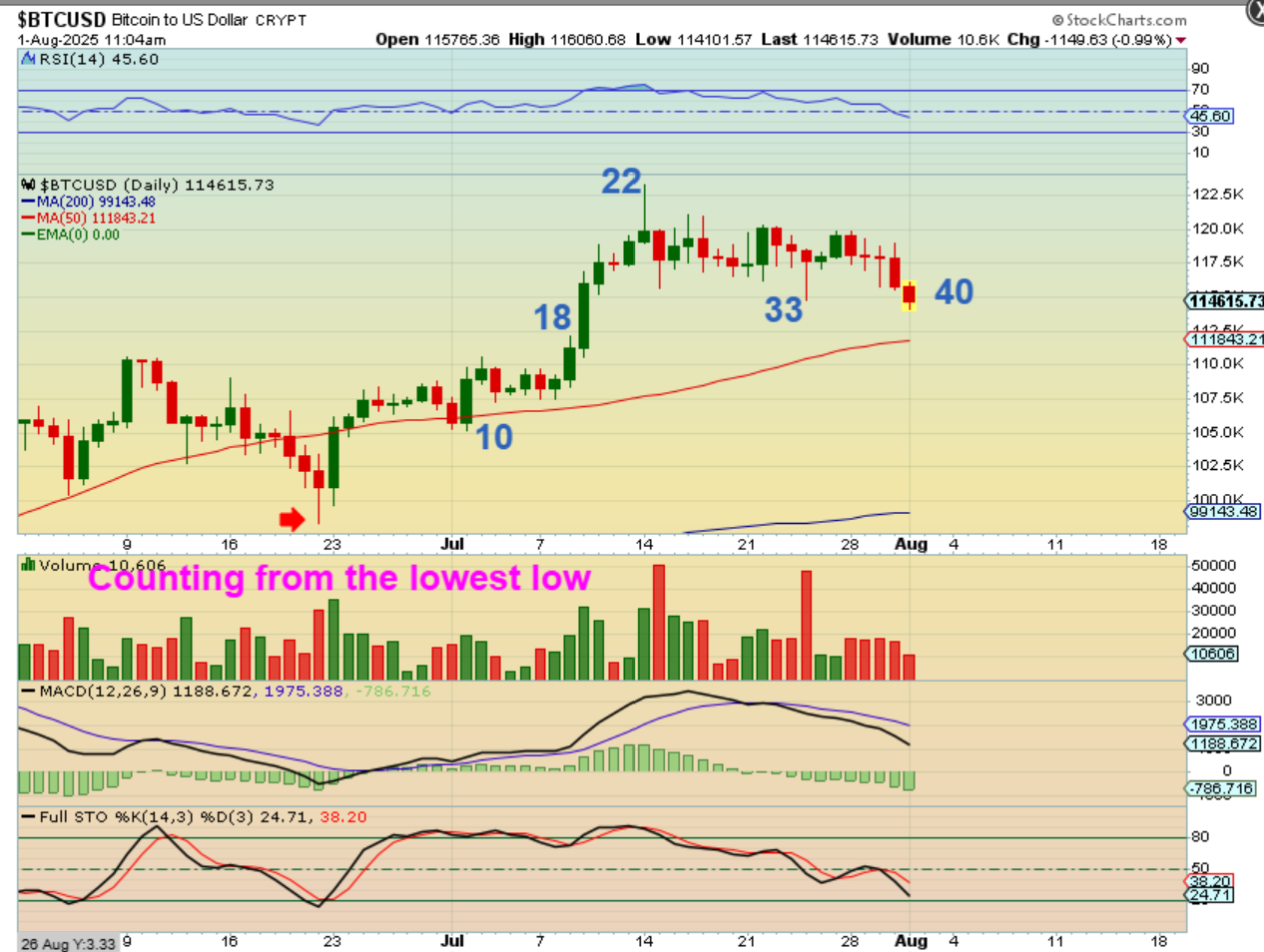 So this set up no longer looks like Bitcoin is ready to run above $130,000 ON THIS RUN.  We’ll have to see what happens after the next low is put into place.  We could see a nice strong rally out of this consolidation after the next dcl, or more chop & even more weakness.  I’ll discuss that in the weekend report too.