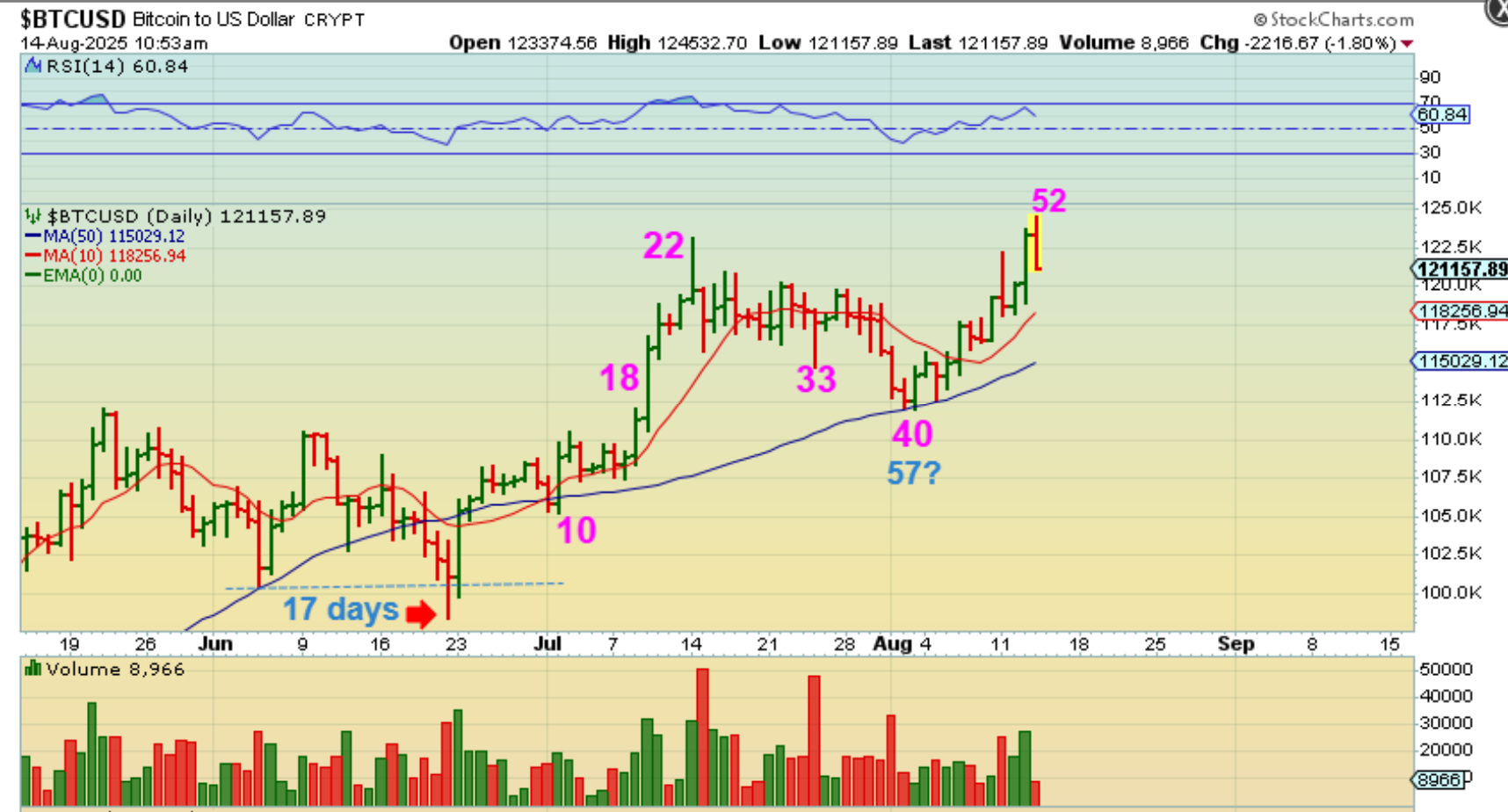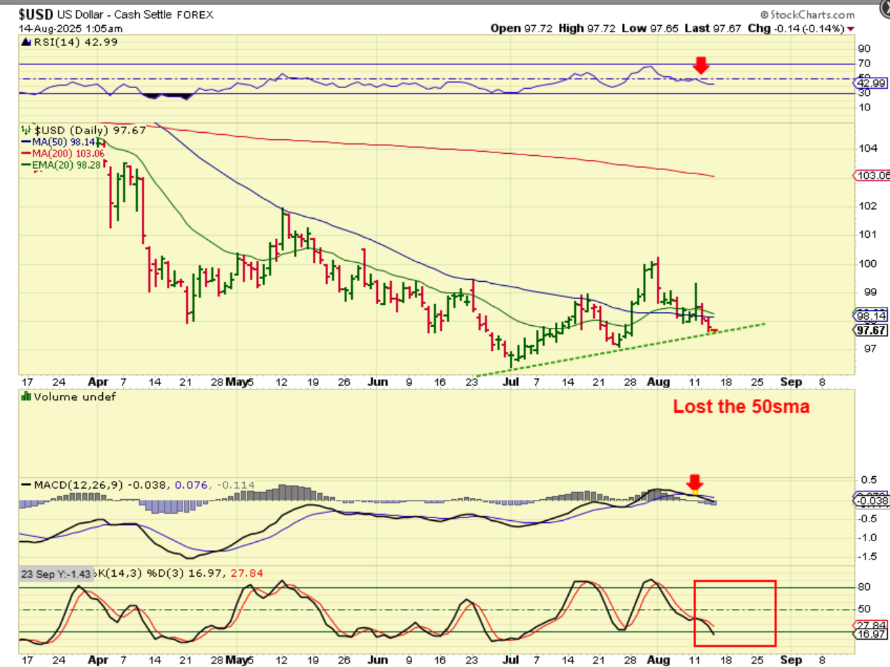 I expected the USD to hold up at the 50sma, but it didn’t. Now it has reached an uptrend line at day 30 (Or 14 of a 2nd daily cycle) and we’ll see if it finds support there. It is finally oversold again.