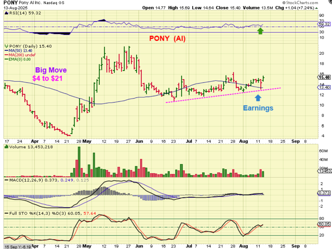 PONY is an AI stock that I was watching with earnings coming up. It initially dropped on earnings and then bounced back on the same day at the 50sma (& it continued to form a trendline). This ran from $4 to $21 out of that ICL, and this is why I take note of those ‘runners’ and wait for a consolidation. We may see something like this in MJ stocks too.