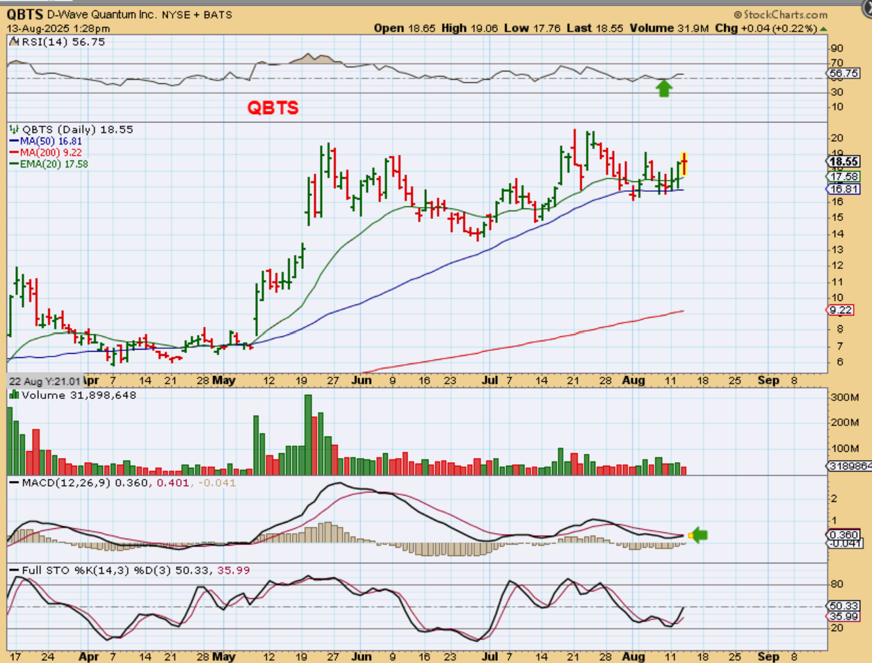 QBTS – This company was in Wednesdays report. I grabbed this chart on Wednesday because QBTS released earnings a few days ago, but it held up at the 50sma. It dropped on Wednesday and started to bounce back off of the 20ema. It closed green.