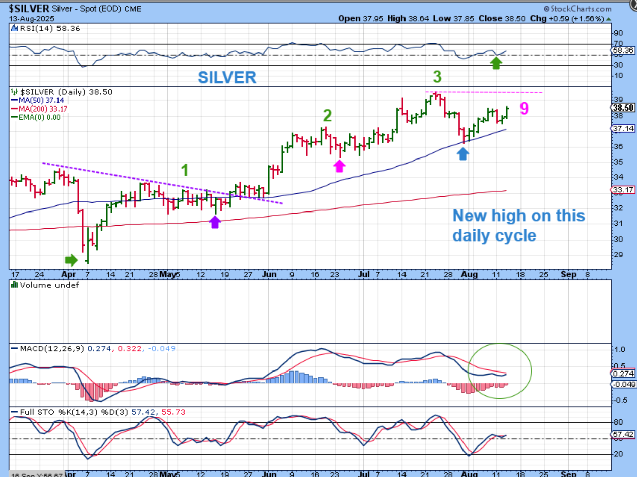 SILVER actually made a new daily cycle high on day 9. If it crosses daily cycle #3’s high, that would be a big sign of strength. Even though we are 4 months out of the ICL, I see bullishness and strength when I look at the MACD curling up and the RSI bouncing at the 50% line, this really looks bullish to me.