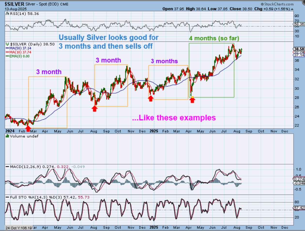 I always look for similarities and differences to gauge strength, weakness,’ odd happenings’, etc. We are already seeing a very long triangle consolidation with Gold, because it refuses to sell off. Now let me show you something with Silver now.