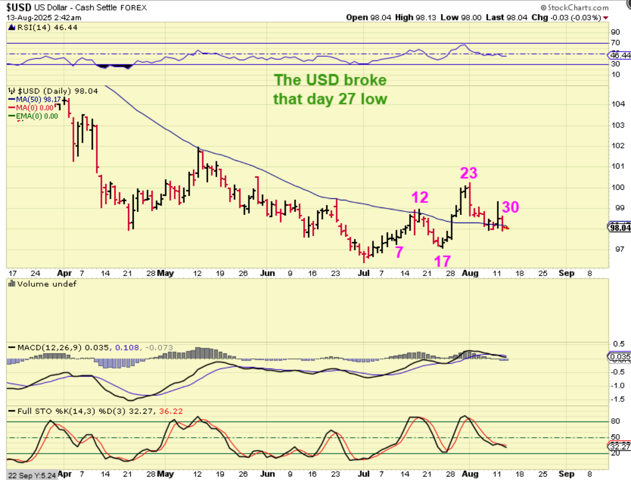 USD – That day 27 was slightly broken on Tuesday, so that would extend this to day 30 – OR – it is possible that day 17 was a dcl? Lately, however, the daily cycles have been long. We still have a higher low and a higher high in place, but it keeps coming close to losing the 50sma.
