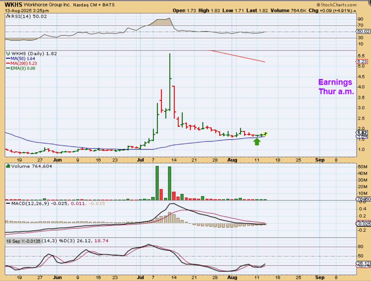WKHS – I remember when WKHS ran from the $1 area to the $5 area in a month. I never chase these since they get too extended, because the drop can be costly. Instead, I put them on a watchlist and try to be patient. WKHS has now dropped all the way down to the 50sma and is back under $2. This set up looks excellent, HOWEVER, they release earnings on Thursday. I would have bought tis but I’m going to wait until they release their report and see how things go.